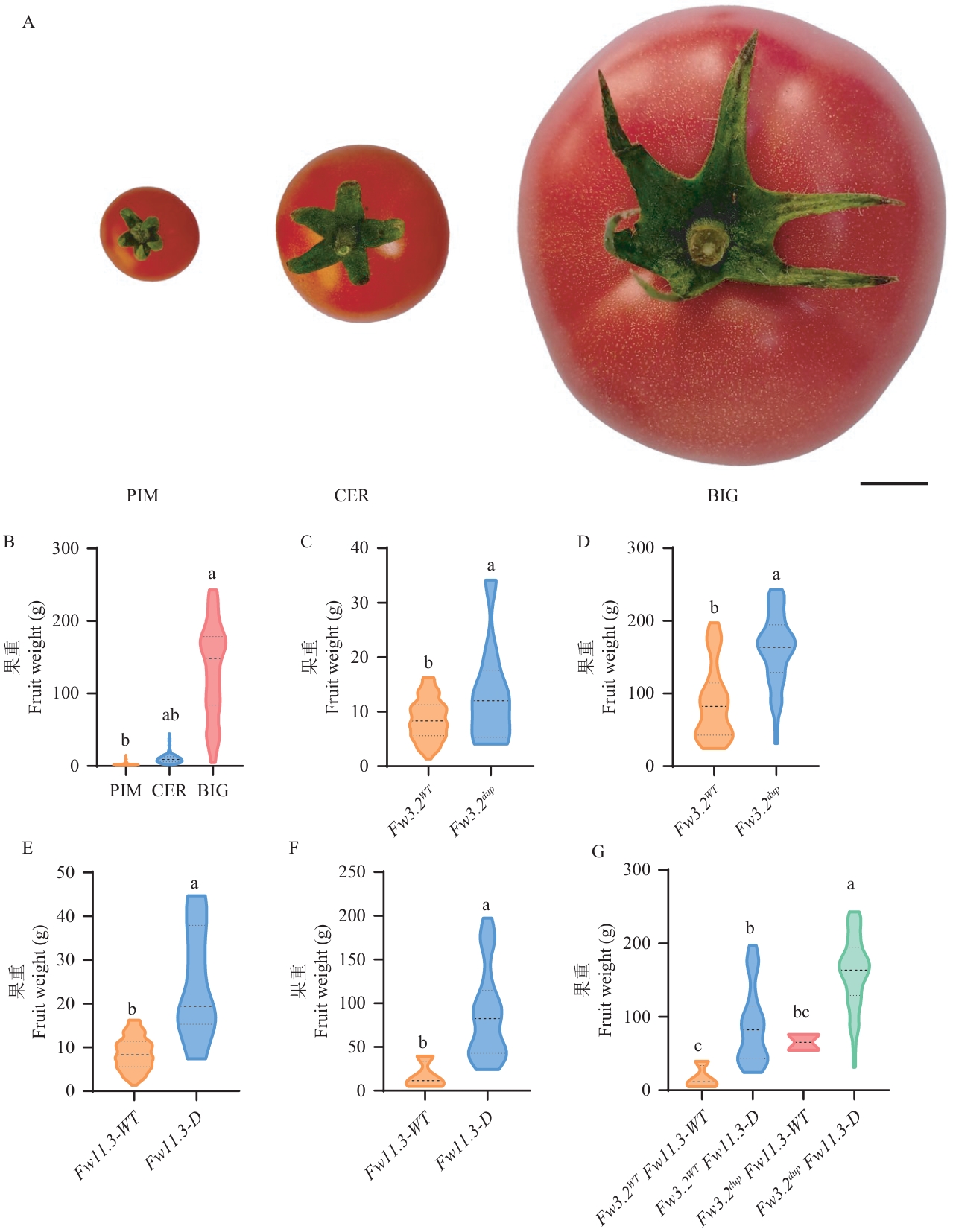 Fig. 5 Phenotypic analysis of fruit weight in different tomato populationsA: Representative images of PIM, CER and BIG varieties. Bar = 1 cm. B: Fruit weight of PIM, CER, and BIG tomatoes. C‒D: Phenotypic variation in fruit weight among distinct Fw3.2 genotypes within CER (C) and BIG (D) populations. E‒F: Phenotypic variation in fruit weight among distinct Fw11.3 genotypes within CER (E) and BIG (F) populations. G: Phenotypic variation in fruit weight among distinct Fw3.2 and Fw11.3 haplotypes within the BIG. Significance of differences was tested using one-way ANOVA for panels B and G, and two-tailed t-tests for panels C‒F. Different letters indicate significant differences (P < 0.05)