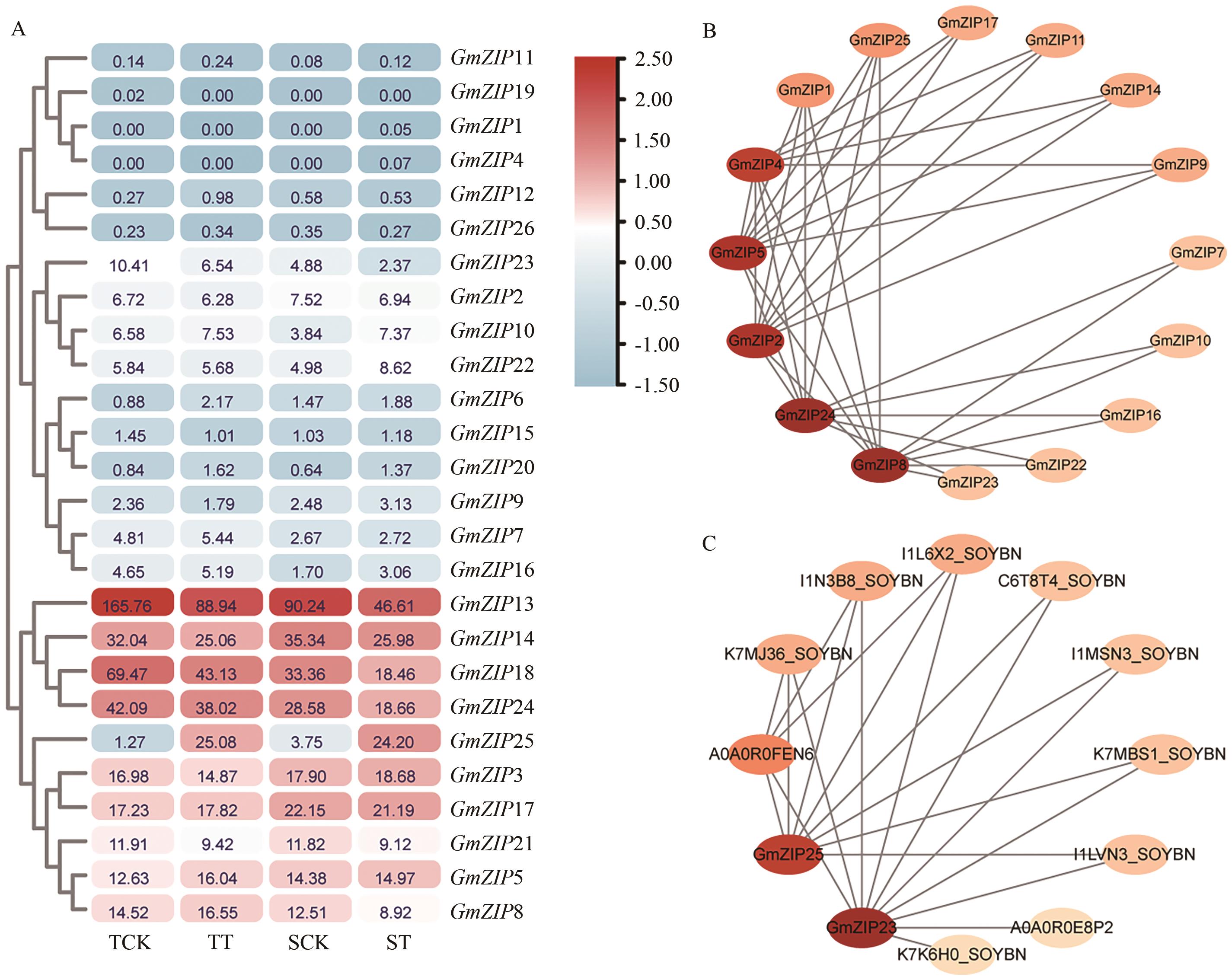 Fig. 6 Expression patterns (A) of GmZIP in response to Al stress and prediction analysis of interacting proteins (B, C) of GmZIPTCK and TT refer to the control group and Al poisoning treated group of soybean Al-tolerant variety Nangong 99-6, while SCK and ST refer to the control group and Al poisoning treated group of soybean Al-sensitive variety Zhongdou 32, respectively