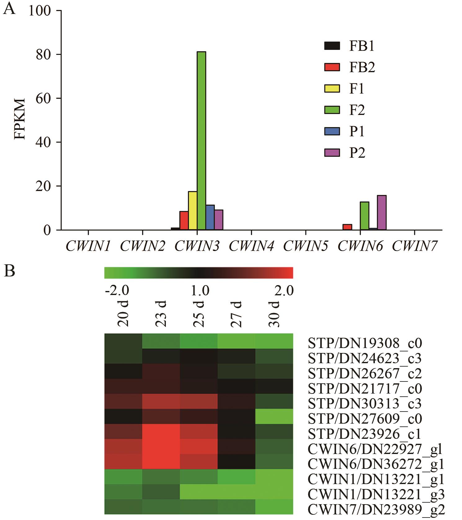 Fig. 3 Expression patterns of CWINs and STPs in red pitayaA: Expression patterns of CWINs during flower bud differentiation, flowering and fruit peel development. FB1-FB2: Two stages during flower bud differentiation. F1-F2: Two stages during flowering. P1-P2: Two stages during fruit peel development. B: Expression patterns of CWINs and STPsduring fruit pulp development. FPKM values of A and B came from the pitaya genome database (http://pitayagenomic.com/) and red pitaya fruit transcriptome sequencing [23], respectively