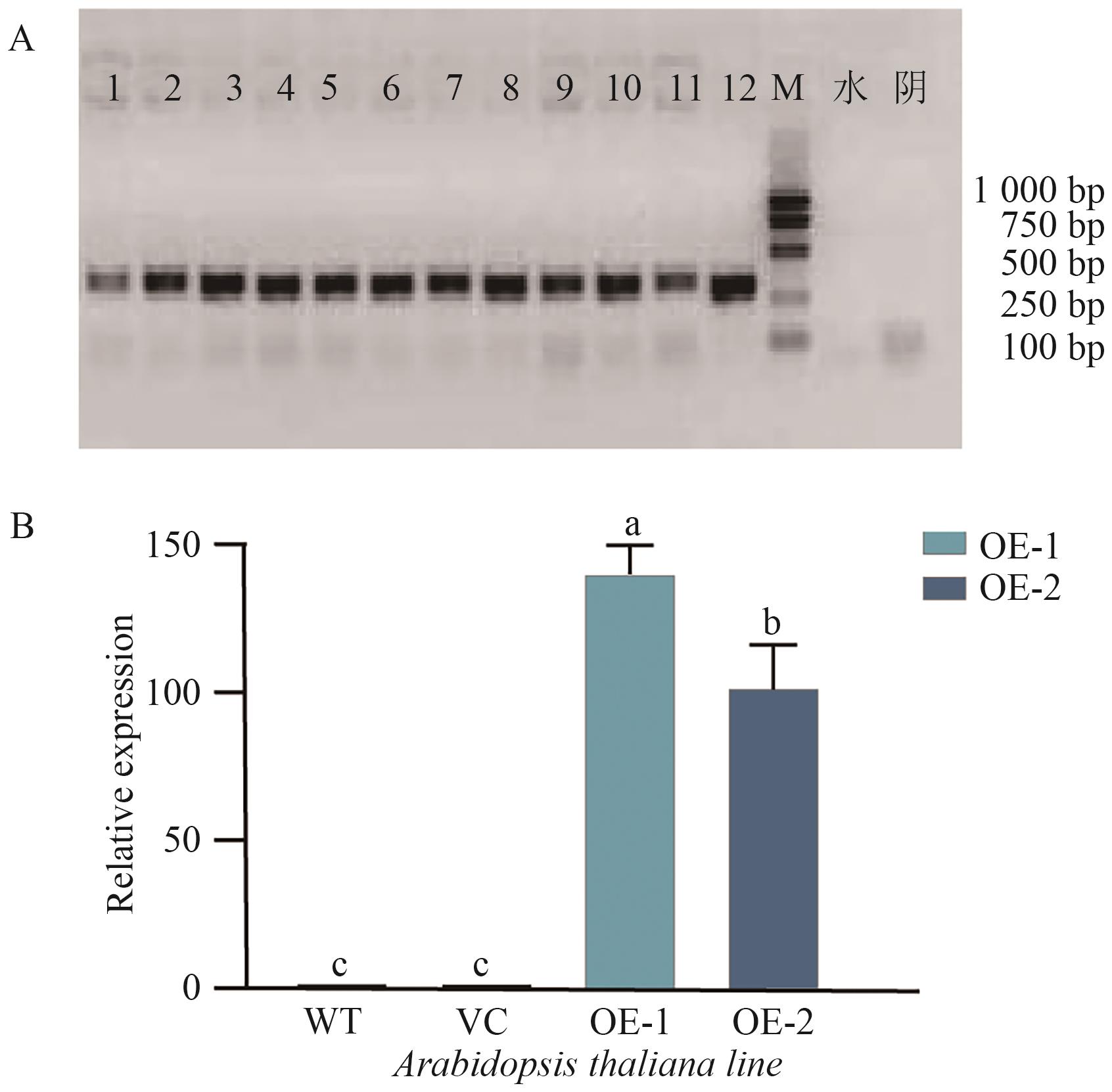Fig. 7 Identification of AtaCYP51G2 transgenic Arabidopsis linesA: Genomic PCR analysis of T2 plants. Lane 1-6: line OE-1; lane 7-12: line OE-2. B: Relative expression of AtaCYP51G2 in wild type (WT), vector control (VC), and transgenic lines (OE-1 and OE-2), determined by qRT-PCR. Data are presented as mean±SD (n=3). Different letters indicate statistically significant differences (P<0.05)