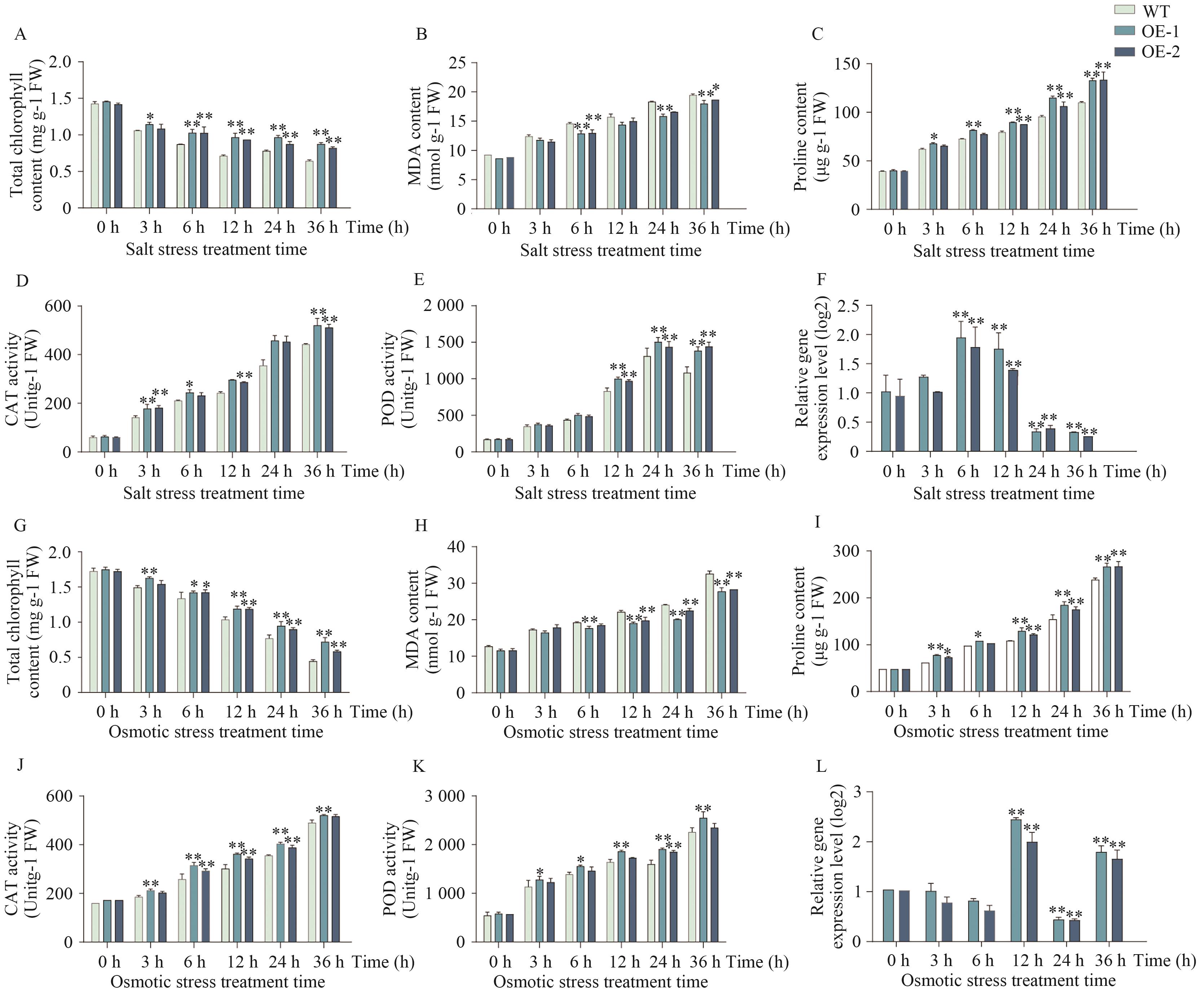 Fig. 11 Physiological measurements of AtaCYP51G2-overexpressing Arabidopsis under salt and osmotic stressA-F: Physiological and biochemical parameters and the relative transcript levels of AtaCYP51G2 overexpression lines under salt stress, whereas panels G-L display the corresponding data under osmotic stress