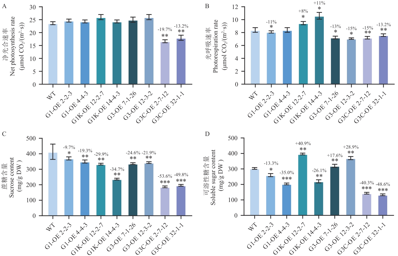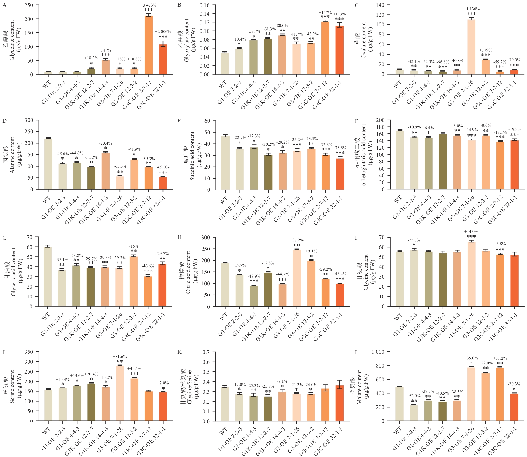 Fig. 5 Content determination of photorespiration metabolites of GCGT tansgenic plants leaves at seedling stageTake the second leaf after hydroponic with Kimura B nutrient solution under natural light until the fourth leaf fully spreads, and the sampling time is 13:00‒15:00, n=3