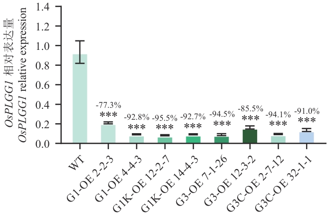 Fig. 3 Phenotypic observation of transgenic rice plantsA: Phenotypic observation of transgenic plants at seedling stage. B: Plant height. C: Maximum length of root. D: Transgenic rice plants of G1-OE and G1K-OE. E: Length of flag leaf. F: Width of flag leaf. G: Transgenic rice plants of G3-OE and G3C-OE. H: Plant height. I: Number of tillers. n=10