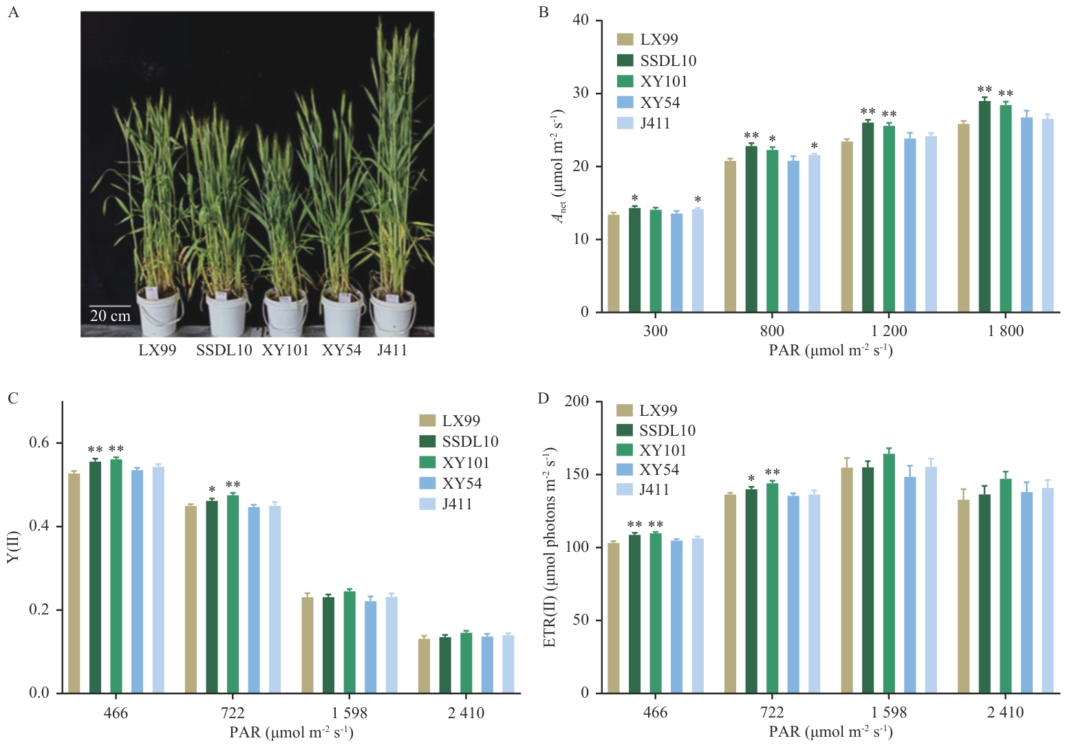 Objective Global warming and a rapidly increasing global population present formidable challenges to food security, necessitating significant advancements in both crop yield improvement and enhanced resilience to environmental stresses. Photosynthesis serves as the foundation of crop productivity, with the cyclic electron flow during the light reactions coupling ATP synthesis and modulating reducing power accumulation. This pathway plays an important role in heat adaptation and photosynthetic efficiency, making the identification and application of its genetic regulators imperative. Method This study utilized representative wheat lines with varying cyclic photosynthetic electron transport activities as references, combined with photosynthetic parameter measurements, protein content assays, and transcriptome sequencing techniques. From the recombinant inbred lines derived from the crossbreeding of wheat varieties Xiaoyan 54 and Jing 411, strains exhibiting polar separation in cyclic electron transport activity were screened and differentially expressed genes were obtained. Result The strains with higher cyclic electron transport activity also demonstrated elevated linear electron transport activity and photosynthetic CO2 assimilation rates, maintaining these advantages under increased light intensity, making them suitable for application as high-efficiency breeding materials. Through differential gene expression analysis, a series of functional genes and transcription factors with potential to enhance cyclic photosynthetic electron transport or overall photosynthetic activity were identified. Selected genes (including TaPnsL2 and TaNAC) were constructed into overexpressing vectors and transformed into the rice cultivar Xiushui 134. The T1 and T2 generation transgenic materials presented advantages in photosynthetic rate during field trials in both Hainan province and Shanghai. Conclusion Through genetic screening or modification targeting the activity of cyclic electron transport, there is potential to enhance the photosynthetic efficiency or adaptability to high light intensity in crops.