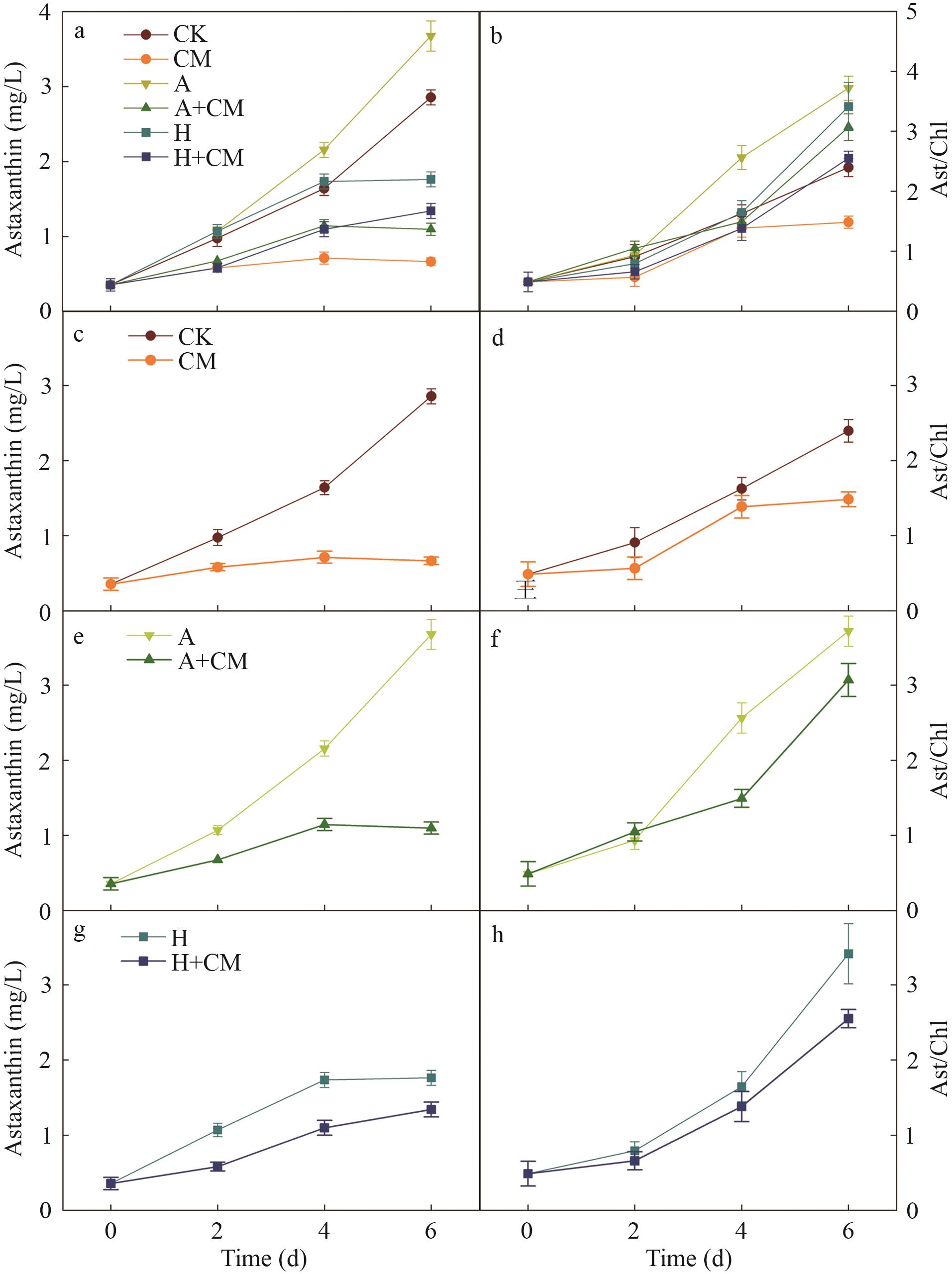Fig. 1 Effects of photorespiration inhibitor CM on the astaxanthin content and astaxanthin/chlorophyll ratio in H. pluvialis cultured with different carbon sourcesa, c, e, g: Astaxanthin content; b, d, f, h: Astaxanthin/chlorophyll ratio