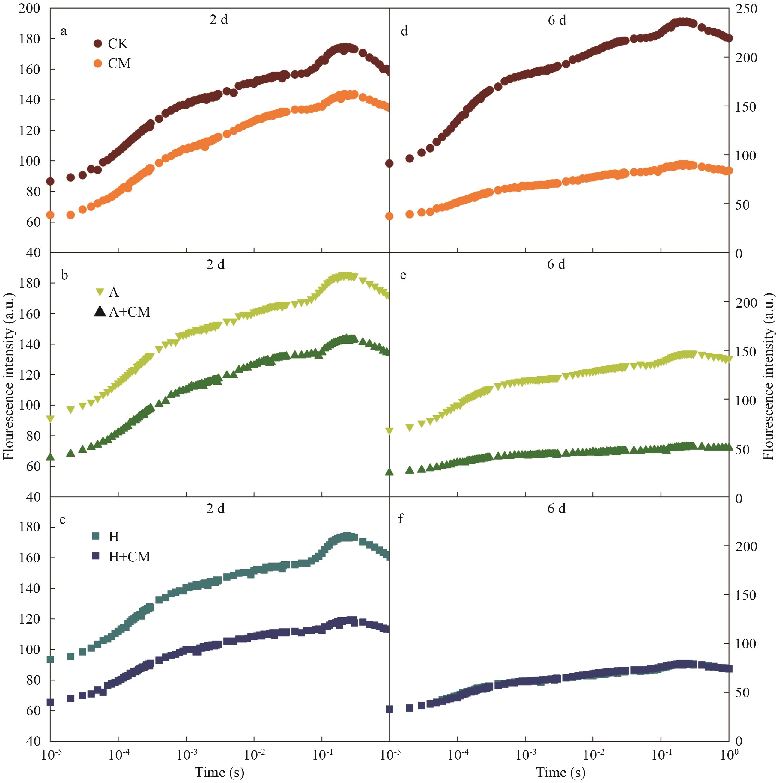 Fig. 4 Effects of photorespiration inhibitor CM on the chlorophyll a fluorescence (OJIP) transients at 2 d and 6 d in H. pluvialis cultured with different carbon sources