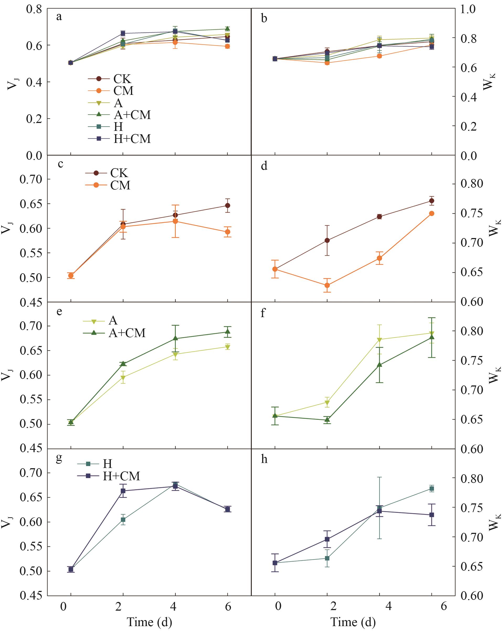 Fig. 5 Effects of photorespiration inhibitor CM on relative variable fluorescence at J-step (VJ) and at K-step (WK) in H. pluvialis cultured with different carbon sourcesa, c, e, g: Relative variable fluorescence at J-step (VJ); b, d, f, h: Relative variable fluorescence at K-step (WK)
