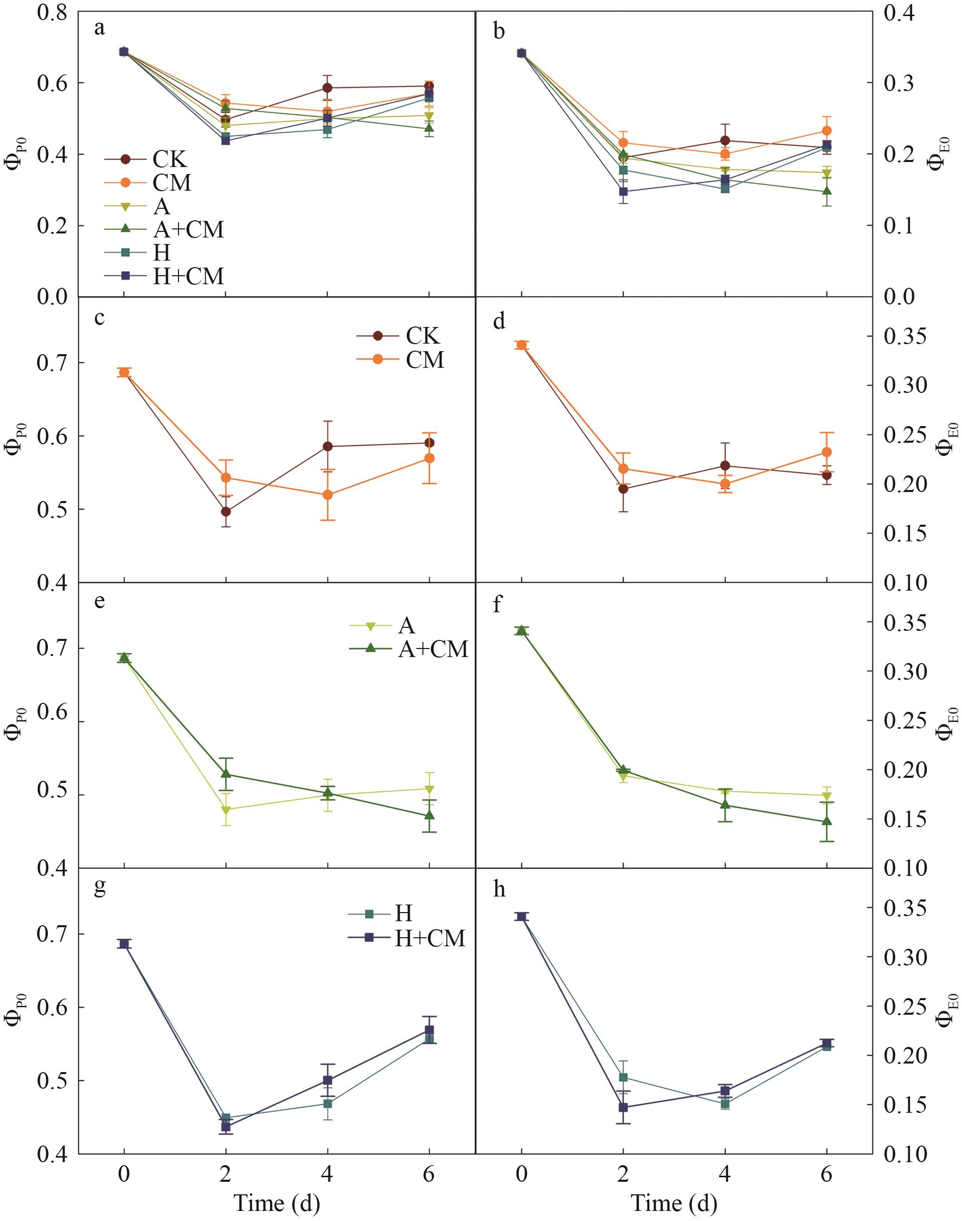 Fig. 6 Effects of photorespiration inhibitor CM on the maximum photochemical efficiency (ΦP0) and the quantum yield of electron transport (ΦE0) in H. pluvialis cultured with different carbon sourcesa, c, e, g: The maximum photochemical efficiency (ΦP0); b, d, f, h: The quantum yield of electron transport (ΦE0)