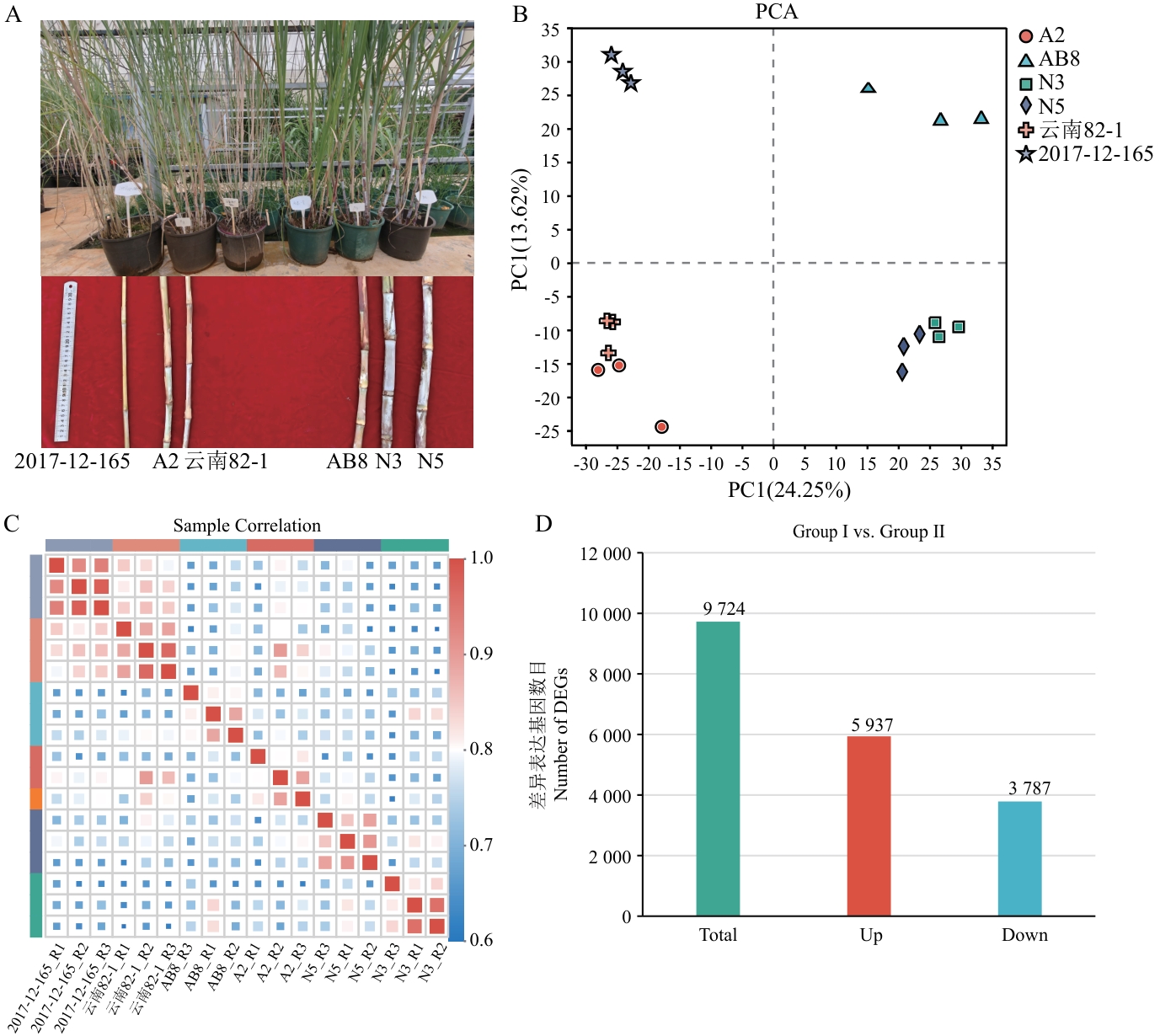 Fig. 2 Transcriptome sequencing analysisA: Phenotypes of six materials in two groups. B: PCA analysis. C: Correlation analysis among samples. D: Bar chart of DEGs between Group Ι and Group Ⅱ