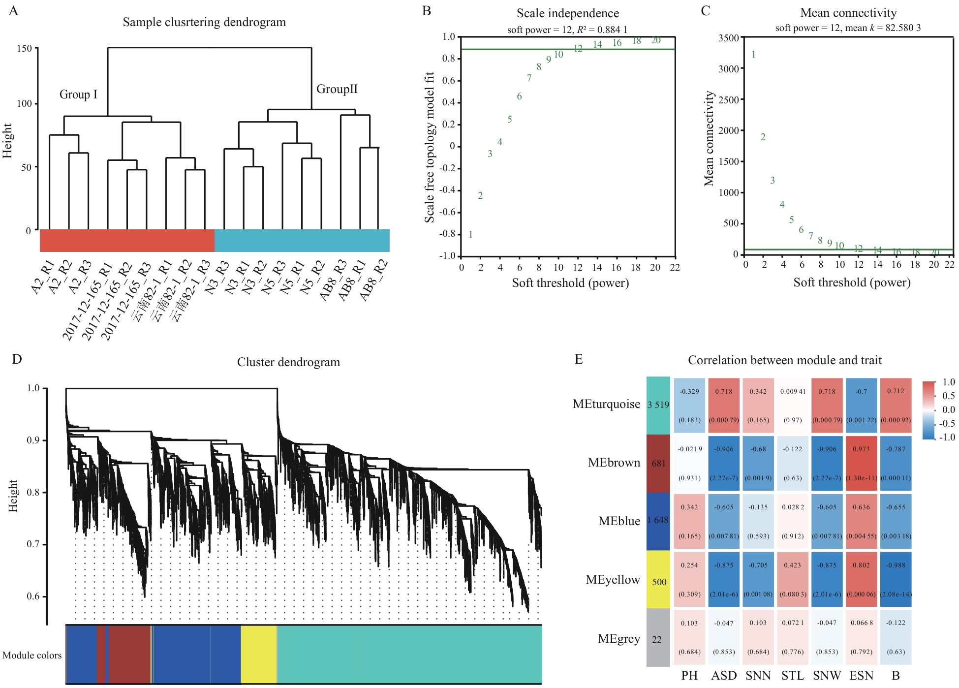 Fig. 4 Construction of WGCNAA: Sample clustering. B: Scale-free fit curve and average connectivity curve. C: Gene clustering and module construction. D: Heatmap of the correlation between modules and phenotypes (red grids indicate positive correlations between samples and modules, and purple grids indicate negative correlations between samples and modules. The values inside and outside the parentheses in the figure are the P-value and the correlation coefficient r, respectively)