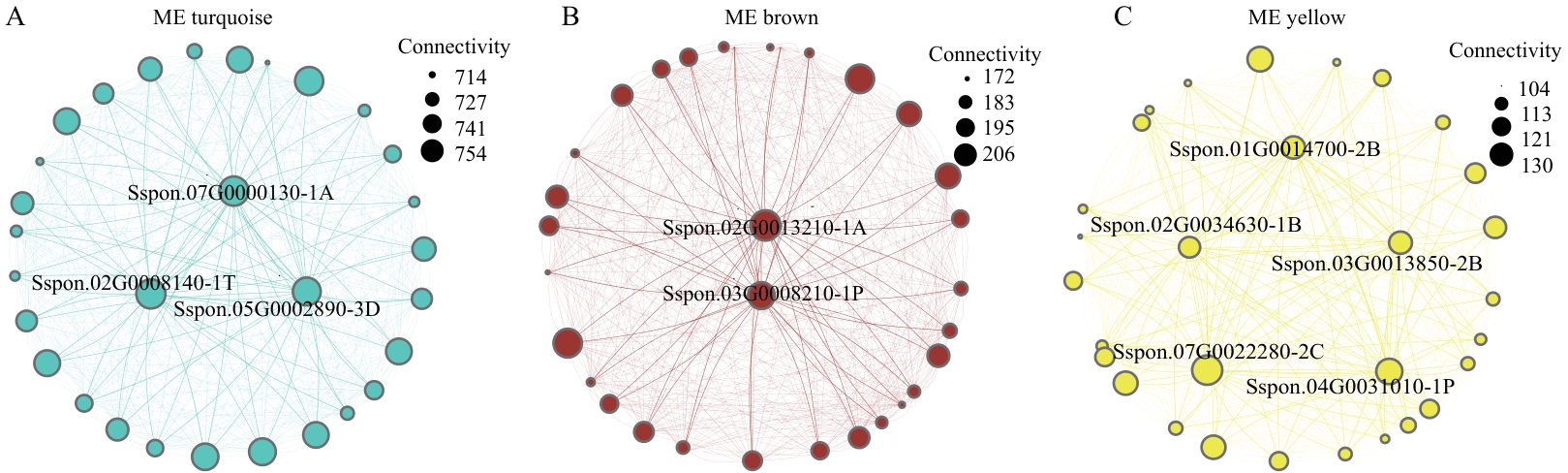 Fig. 5 Interaction networks of hub genes within key modulesA: Turquoise module. B: Brown module. C: Yellow module (The sizes of nodes and labels indicatethe connectivity of genes)