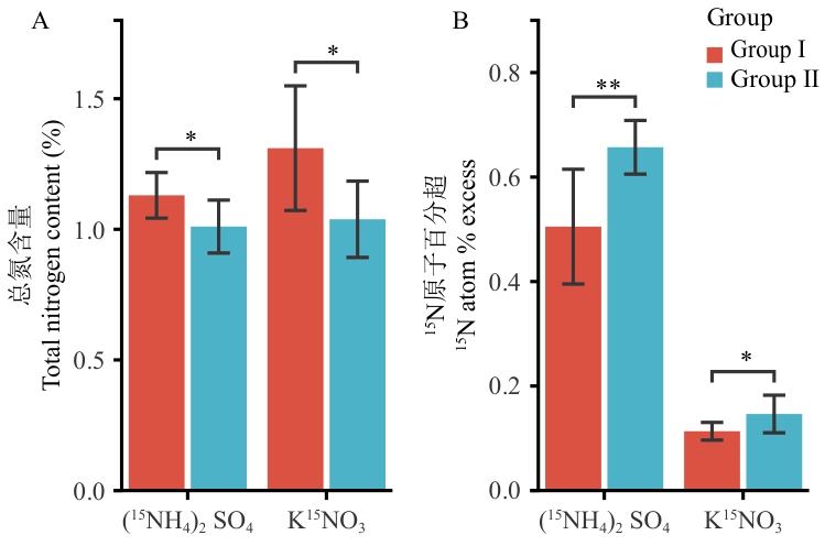 Fig. 7 Dynamics of root total nitrogen content (A) and ¹⁵N uptake (B) under ammonium and nitrate nutrition in two sugarcane groupsData are presented as mean ± SD (n = 3). Significant differences between Group I and Group II under the same nitrogen source were determined by independent-samples t test. * and ** indicate significant differences at P < 0.05 and P < 0.01, respectively
