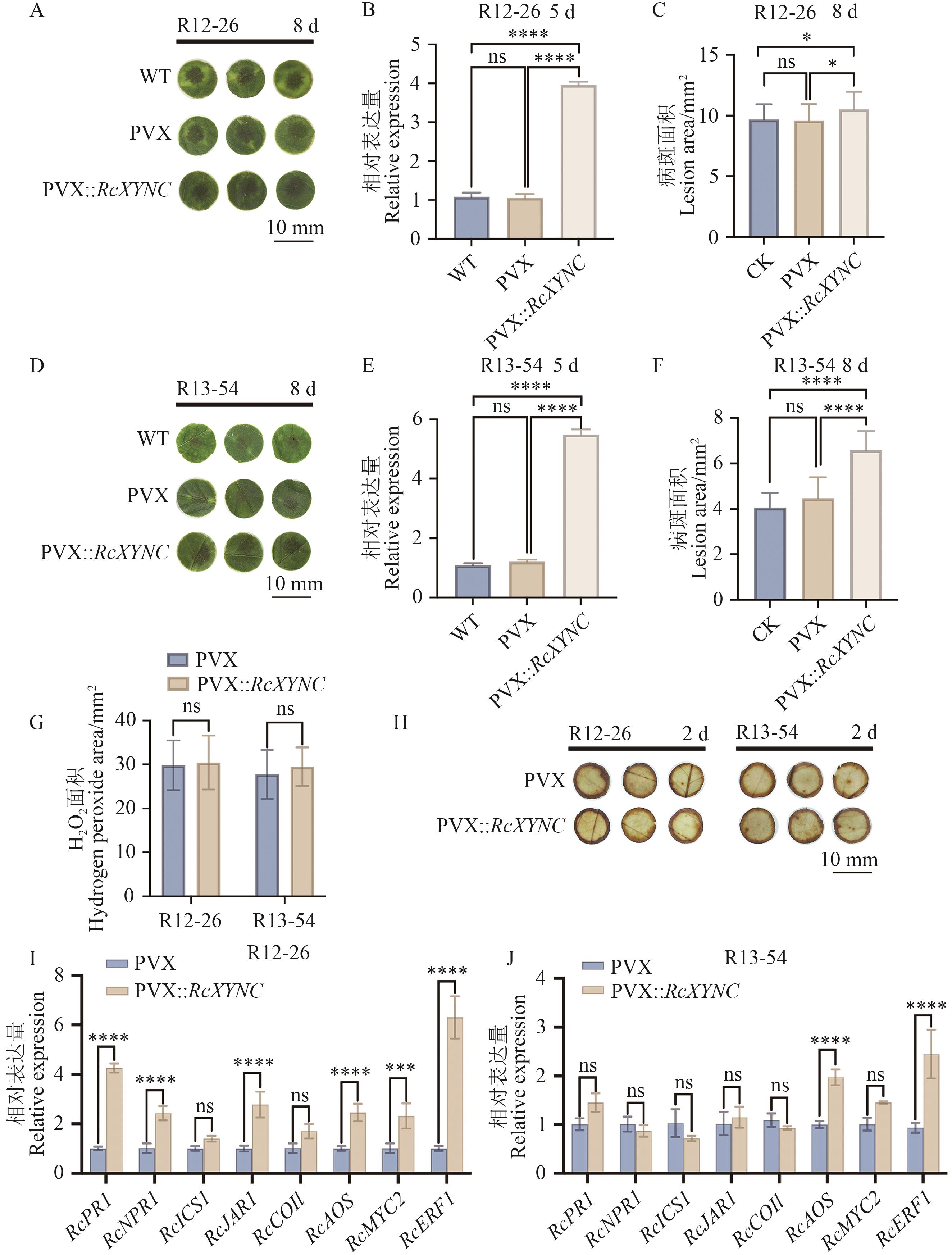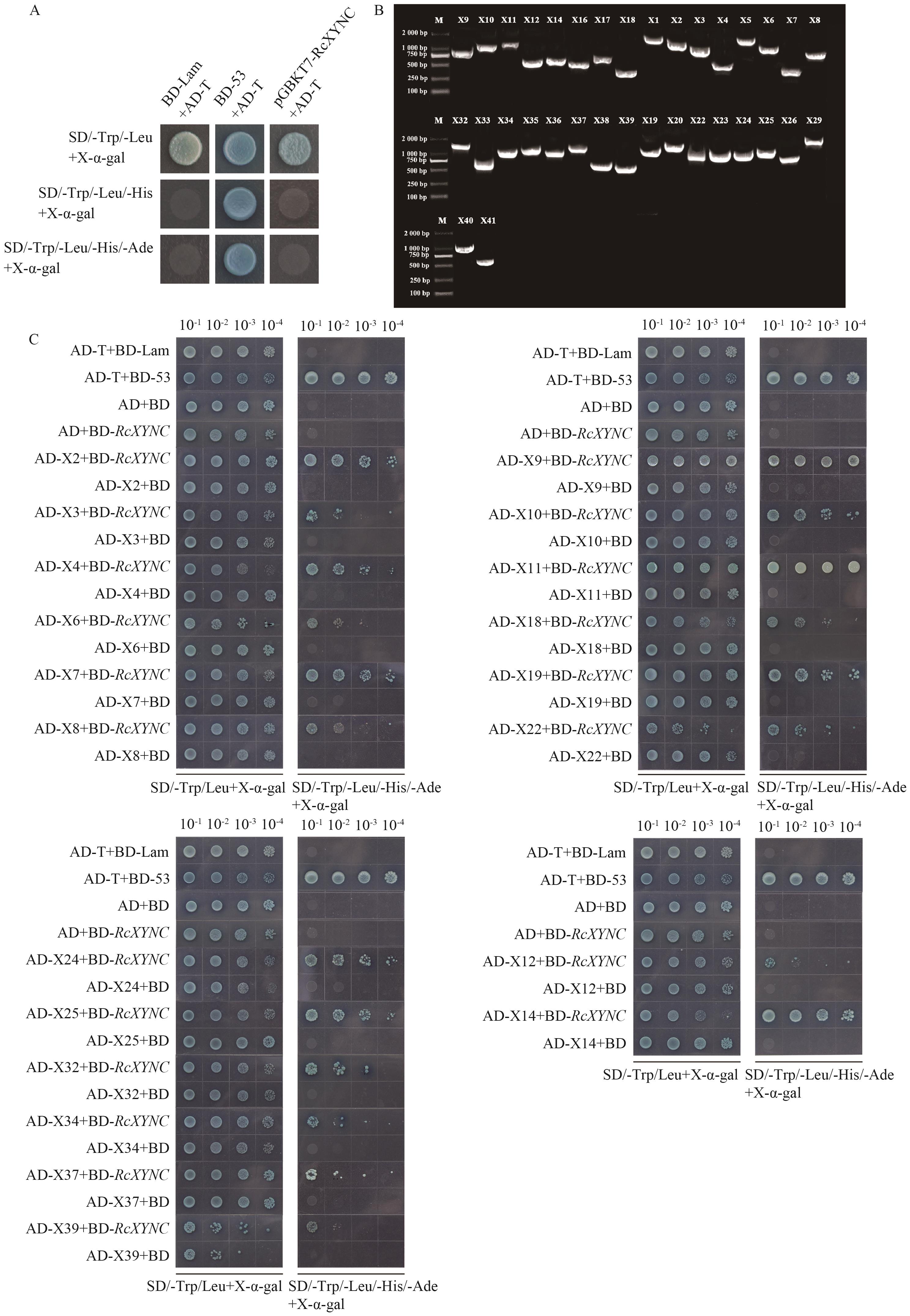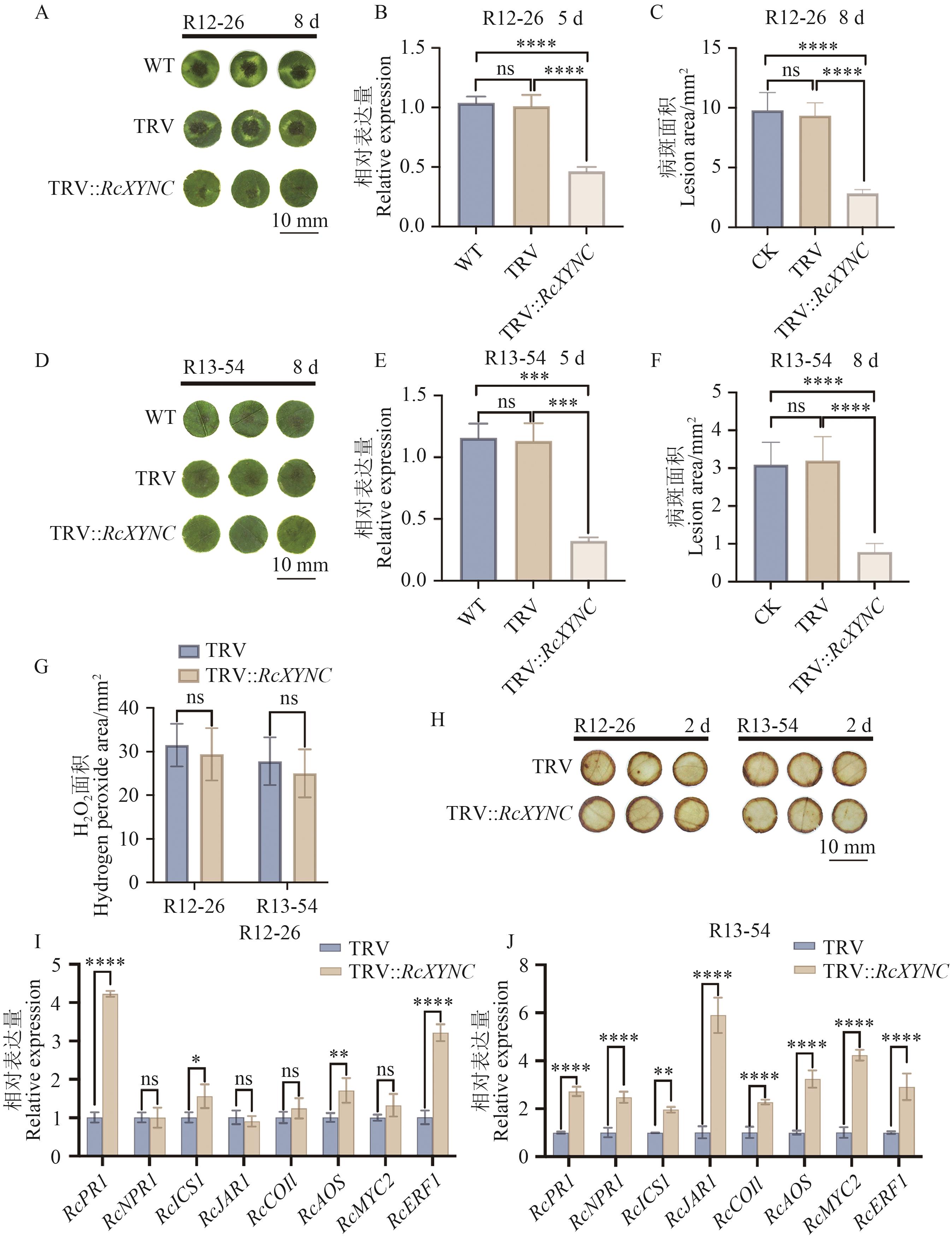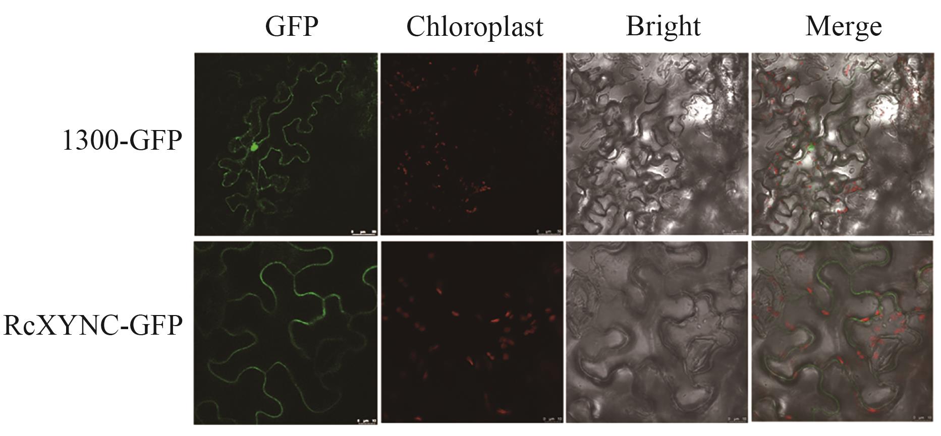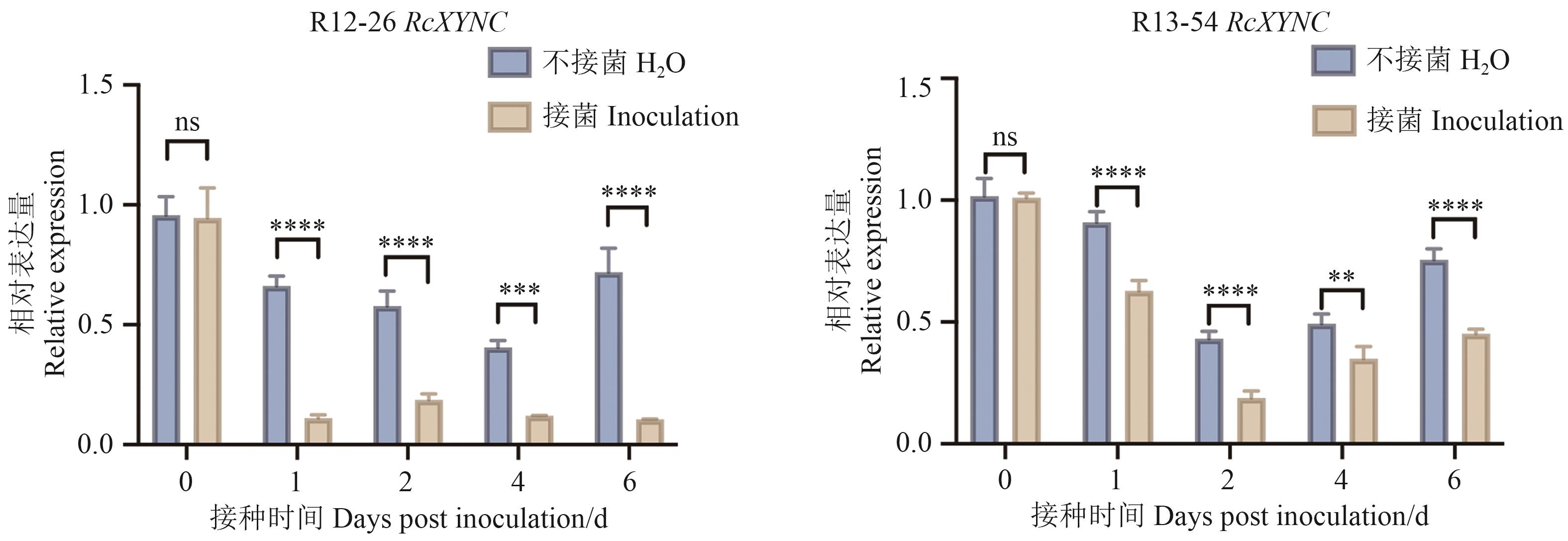 Objective The black spot disease caused by Marssonina rosae is the most prevalent fungal disease of garden roses, severely impacting the ornamental and economic value. Previous studies have shown that the xylan hydrolase gene RcXYNC was differentially expressed in susceptible and highly resistant rose strains; however, the regulatory mechanism remains unclear. The objective of our research is to investigate the function of RcXYNC and its resistance mechanism to black spot disease. Method Firstly, the coding and promoter sequences of RcXYNC were cloned from the susceptible rose strain R12-26 and highly resistant strain R13-54. The relative expression of RcXYNC of M. rosae-infected leaves at different stageswas detected by quantitative real-time PCR (RT-qPCR). Then, the function of RcXYNC was analyzed by transient overexpression and virus-induced gene silencing (VIGS) and the H2O2 accumulation, transcription levels of defense-related genes in the salicylic acid and jasmonic acid/ethylene signaling pathways were measured. Finally, the target proteins interacting with RcXYNC were identified by yeast two-hybrid system. Result The coding and promoter sequences of RcXYNC were consistent in highly resistant and susceptible strains, both containing a conserved domain of Glyco-10 and stress responsive elements. Transient overexpression of RcXYNC led to a significant increase in black spot areas on rose leaves while silencing of RcXYNC resulted in a significant reduction in black spot areas. Transient overexpression or silencing of RcXYNC significantly increased the expressions of most salicylic acid and jasmonic acid/ethylene signaling pathway defense-related genes in rose leaves, while the rest genes showed no significant changes. Total 20 proteins interacting with RcXYNC were discovered, and most of them were involved in plant cell metabolism processes. Conclusion RcXYNC is a negative regulator to defense against M. rosae, potentially reducing resistance of roses to black spot disease by affecting the salicylic acid and jasmonic acid/ethylene signaling pathways.