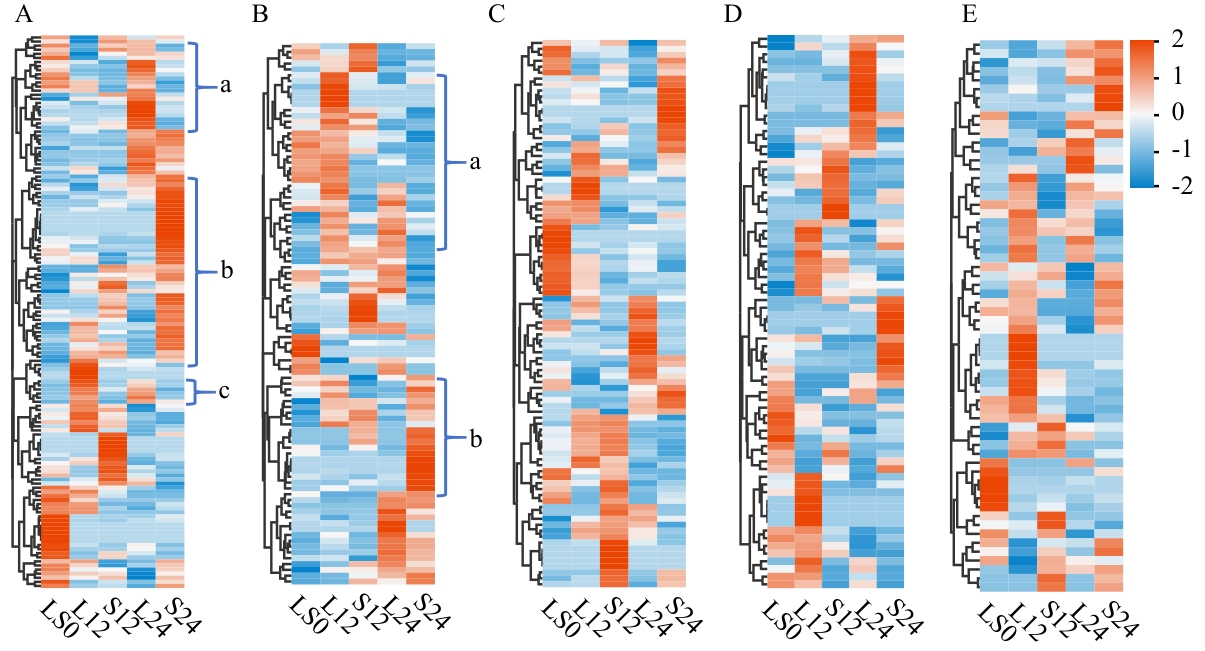 Fig. 2 Clustering heatmap of five classes of metabolitesA: Organic acids and their derivatives. B: Organic oxygen-containing compounds. C: Lipids and lipophilic molecules. D: Phenylpropanoids and polyketides. E: Benzoheterocyclic compounds. Each plot is row-normalized and row-clustered, with red and blue representing upregulation and downregulation, respectively. Lowercase letters a, b, and c indicate regions where metabolites show significant expression differences between long-day and short-day conditions