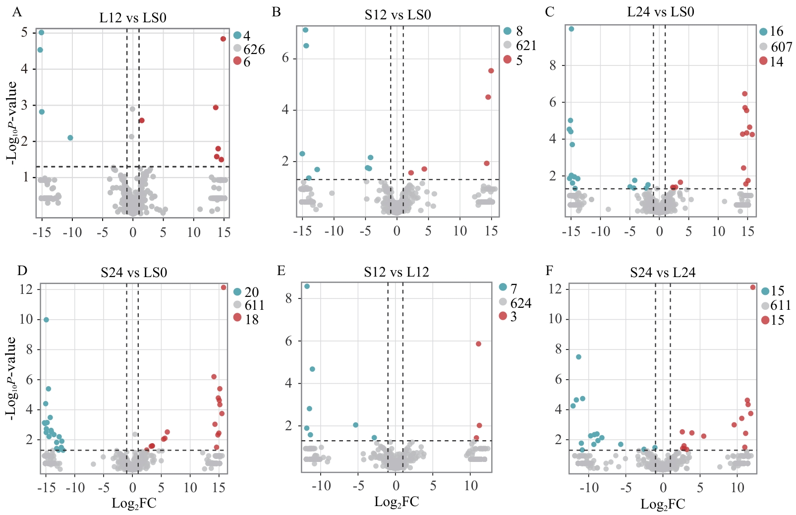 Fig. 3 Volcano plots of differential metabolites for each comparison groupThe x-axis refers to the fold change of each substance in the group comparison, taken as the logarithm base 2. The y-axis indicates the P-value from the t-test, taken as the logarithm base 10. Each dot refers to a metabolite, with red, blue, and gray colors corresponding to significantly up-regulated, significantly down-regulated, and non-significantly changed metabolites, respectively. The dots and numbers in the upper right corner indicate the number of metabolites labeled in different colors