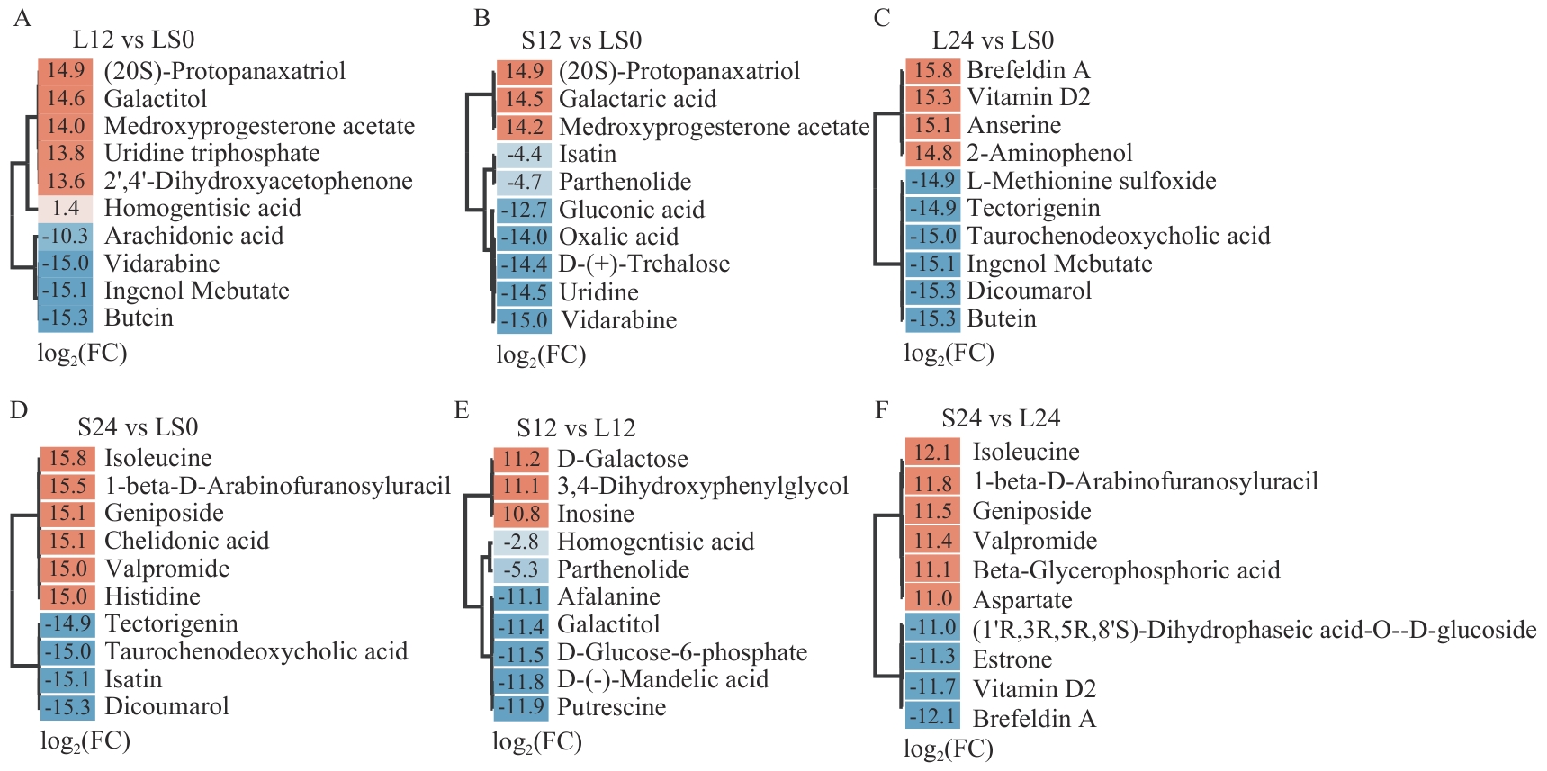 | S12 vs L12 | 腐胺 Putrescine | 2.08 | 11.86 | 1.28E-02 | DOWN |