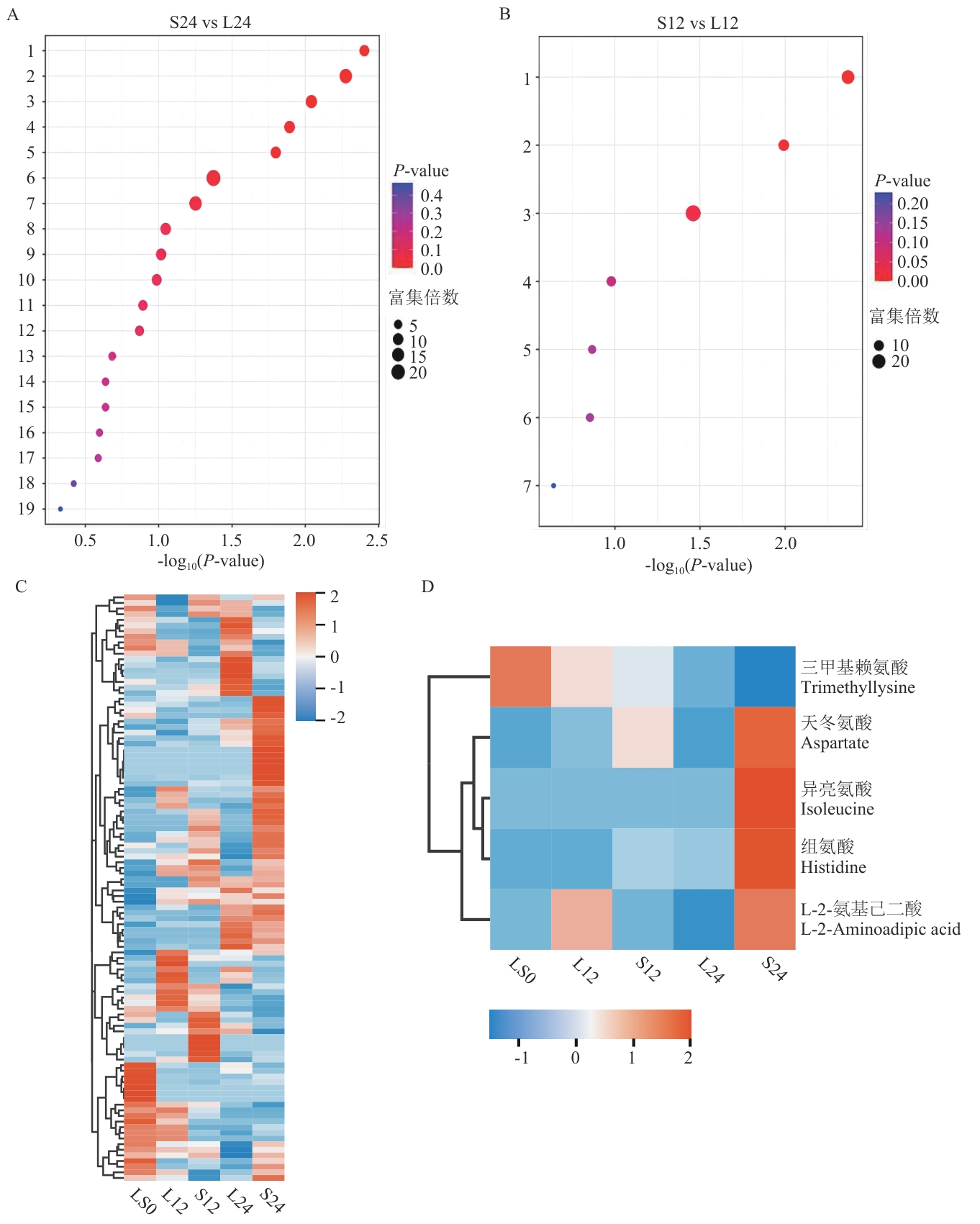 Fig. 5 Enrichment bubble plot of KEGG pathways and heatmap of amino acid-related metabolitesA and B: KEGG pathway enrichment bubble plots for S24 vs L24 and L12 vs S12 groups, respectively. C: Quantitative clustering heatmap of all amino acid metabolites. D: Quantitative clustering heatmap of differential amino acid metabolites. In the bubble plots, larger bubbles indicate a higher number of differentially enriched metabolites in that pathway. In Fig. A, 1: aminoacyl-tRNA biosynthesis; 2: histidine metabolism; 3: β-alanine metabolism; 4: lysine degradation; 5: alanine, aspartate, and glutamate metabolism; 6: phosphoester and phosphorylation metabolism; 7: biosynthesis of valine, leucine, and isoleucine; 8: α-linolenic acid metabolism; 9: arginine biosynthesis; 10: nicotinate and nicotinamide metabolism; 11: pantothenate and CoA biosynthesis; 12: citric acid cycle (TCA cycle); 13: oxalate and dicarboxylate metabolism; 14: glycerophospholipid metabolism; 15: unsaturated fatty acid biosynthesis; 16: degradation of valine, leucine, and isoleucine; 17: tryptophan metabolism; 18: purine metabolism; 19: steroid hormone biosynthesis. In Fig. B, 1: galactose metabolism; 2: tyrosine metabolism; 3: biosynthesis of ubiquinone and other terpenoid-quinones; 4: glutathione metabolism; 5: amino sugar and nucleotide sugar metabolism; 6: arginine and proline metabolism; 7: purine metabolism. Fig. C and D: The heatmaps are row-normalized and clustered, with red indicating upregulation and blue indicating downregulation