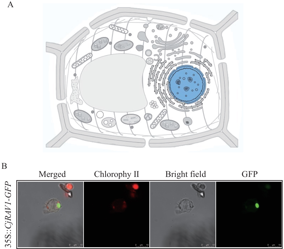 Fig. 7 Subcellular localization of the CjRAV1A: The localization prediction results of CjRAV1 in UniProt. B: Subcellular localization analysis of 35S::CjRAV1-GFP
