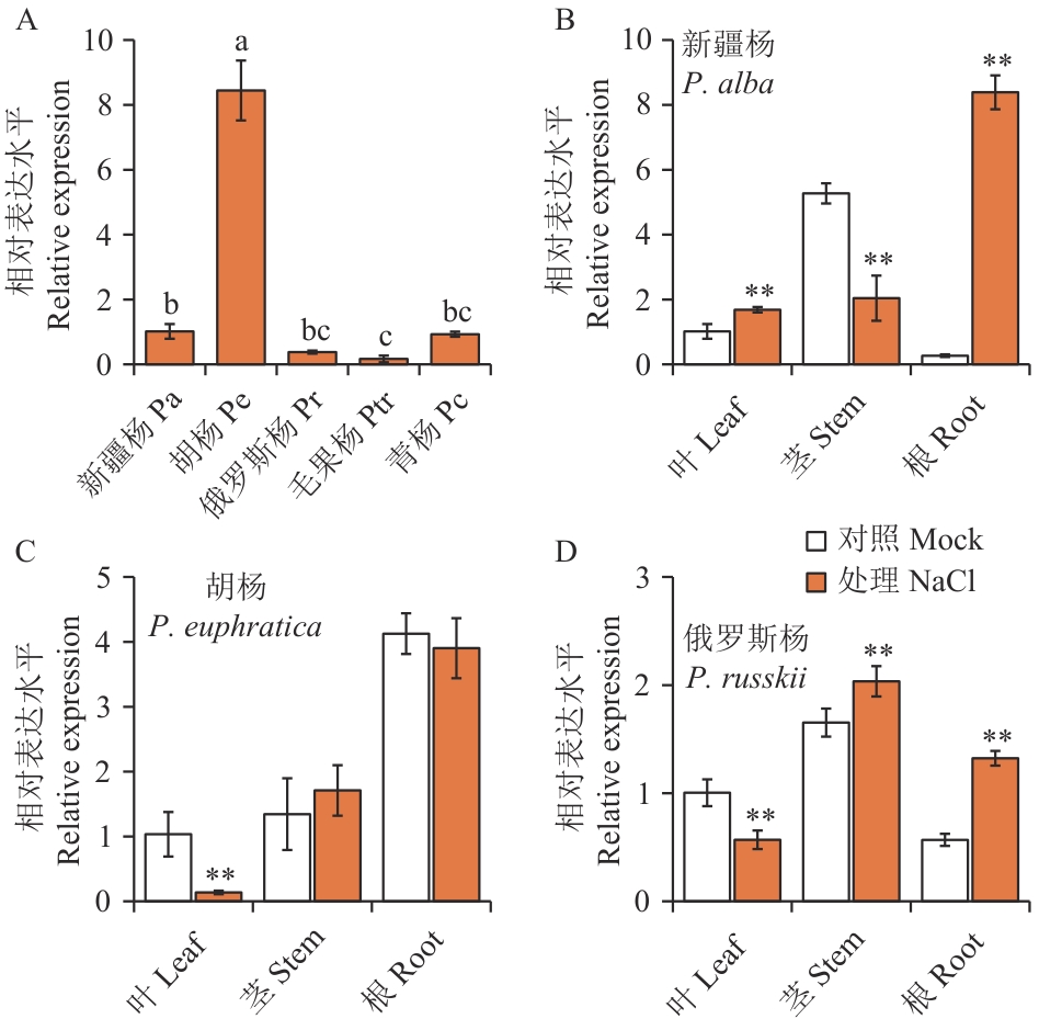 Objective SOS1 (salt overly sensitive 1), a Na+/H+ antiporter located on the plasma membrane, plays a crucial role in plant responses to salt stress. Comparative analysis of SOS1 gene promoters from different Populus species would provide an important foundation for understanding and applying SOS1 gene and its promoters for stress resistance improvement. Method The study used different tree species of the genus Populus as experimental materials and the expression patterns of the SOS1 gene was analyzed by real-time quantitative PCR. The promoter fragments of the SOS1 gene were cloned from P. alba, P. euphratica, and P. russkii, and were ligated with the GUS (β-glucuronidase) reporter gene and transformed into Populus tomentosa to obtain transgenic plants. The tissue specificity and response to salt stress of the promoter were studied by GUS histochemical staining and enzyme activity quantification using transgenic P. tomentosa. Result The expression pattern of SOS1 genes varies significantly among different tree species, e.g. under salt stress, the expression of SOS1 gene in the stem of P. alba is upregulated, while there is no significant change in P. euphratica, and is downregulated in P. russkii. All three cloned promoter fragments can drive the expression of the GUS gene in the leaves, stems, and roots of transgenic P. tomentosa, presenting promoter activity, with higher activity in the stems and roots. The SOS1 promoter from P. alba is active in the epidermis and cortex of the stem, but has very low activity in the phloem, cambium, and xylem; the SOS1 promoter from P. russkii shows higher activity in the xylem, but very low activity in the cambium and bark; the SOS1 promoter from P. euphratica is active in all parts, with the highest activity in the cambium. Under salt stress conditions, the activity of all three promoters increases. Conclusion Different poplar SOS1 gene promoters may respond to salt stress but have different tissue specificity.