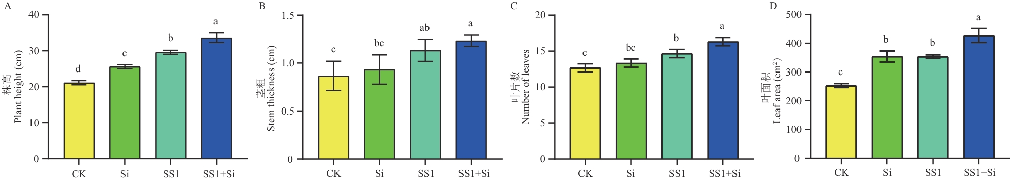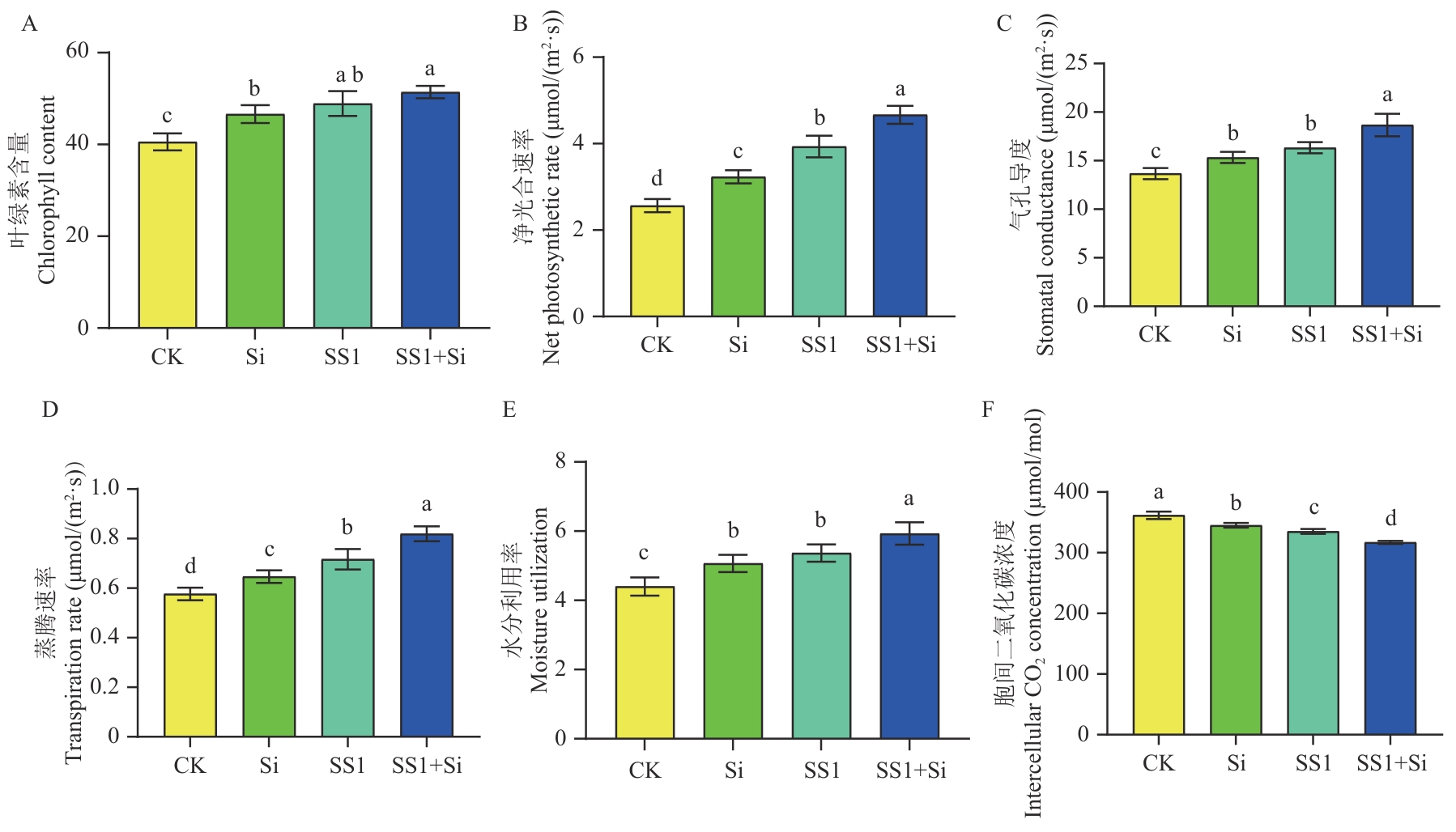 Objective A growth-promoting Bacillus cereus strain SS1 was identified previously in our laboratory. The objective of this study is to examine the combined effects of silicon nanopowder and B. cereus SS1 on the growth of tobacco, as well as to explore the related functional mechanism. Method Zhongyan 101 was used as experimental material. Tobacco seedlings were treated with silicon nanopowder and SS1 alone or in combination, the growth and photosynthetic indexes, as well as the activities and gene expressions of nitrogen metabolism-related enzymes of each treatment were detected. Result The nanometer silica and SS1 at certain concentration, and co-treatment of nanopowder and SS1 all promoted the growth of tobacco, and the promotion effect of co-treatment was the most significant. The above-ground growth indexes of co-treated tobacco, such as plant height, stem diameter, leaf number, and leaf area, were higher than those of the seedlings treated with silicon nanopowder or SS1 alone and the non-treated control plants; moreover, the root length, root weight and root-shoot ratio also significantly increased by co-application. Meanwhile, the results showed that the co-treatment of SS1 and silicon nanopowder significantly increased the chlorophyll content, net photosynthetic rate, stomatal conductance and other photosynthetic indexes of tobacco plants. The activities of nitrate reductase (NR) and glutamine synthetase (GR) as well as the expressions of related genes NtNIA1 and NtGS1 also more significantly increased by SS1 and silicon nanopowder co-treatment compared to treatment with SS1 or silicon nanopowder alone. Conclusion The combination of silicon nanopowder and SS1 may promote plant growth by ameliorating the photosynthetic performance and promoting nitrogen metabolism of plant.