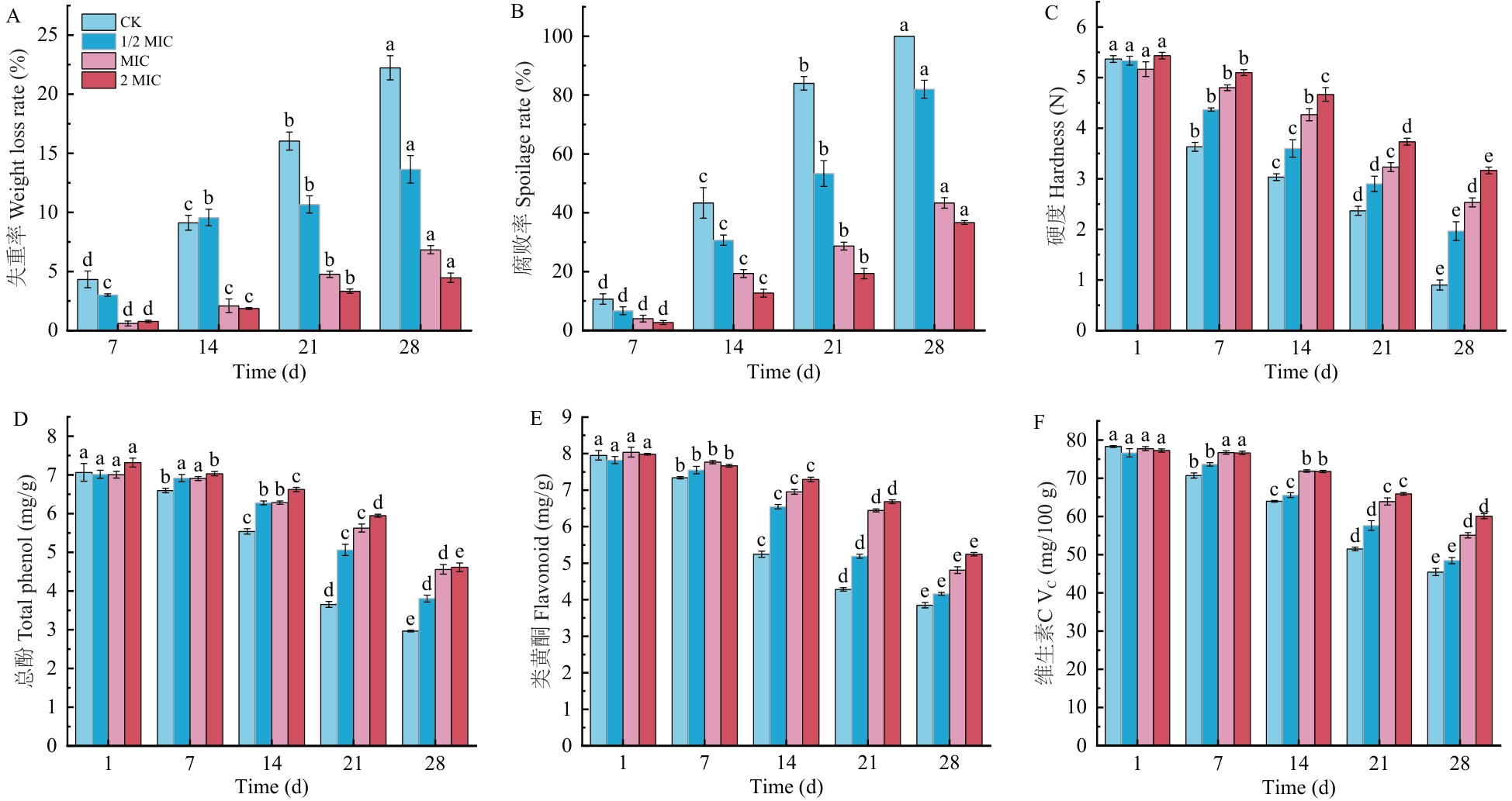 Fig. 7 Influences of different concentrations of Pediococcus acidilactici P-2 CFS on the weight loss rate, spoilage rate, hardness, total phenolic content, flavonoid content and vitamin C content of Lonicera caerulea L.Different letters indicate significant differences in different treatment methods (P<0.05). The same below