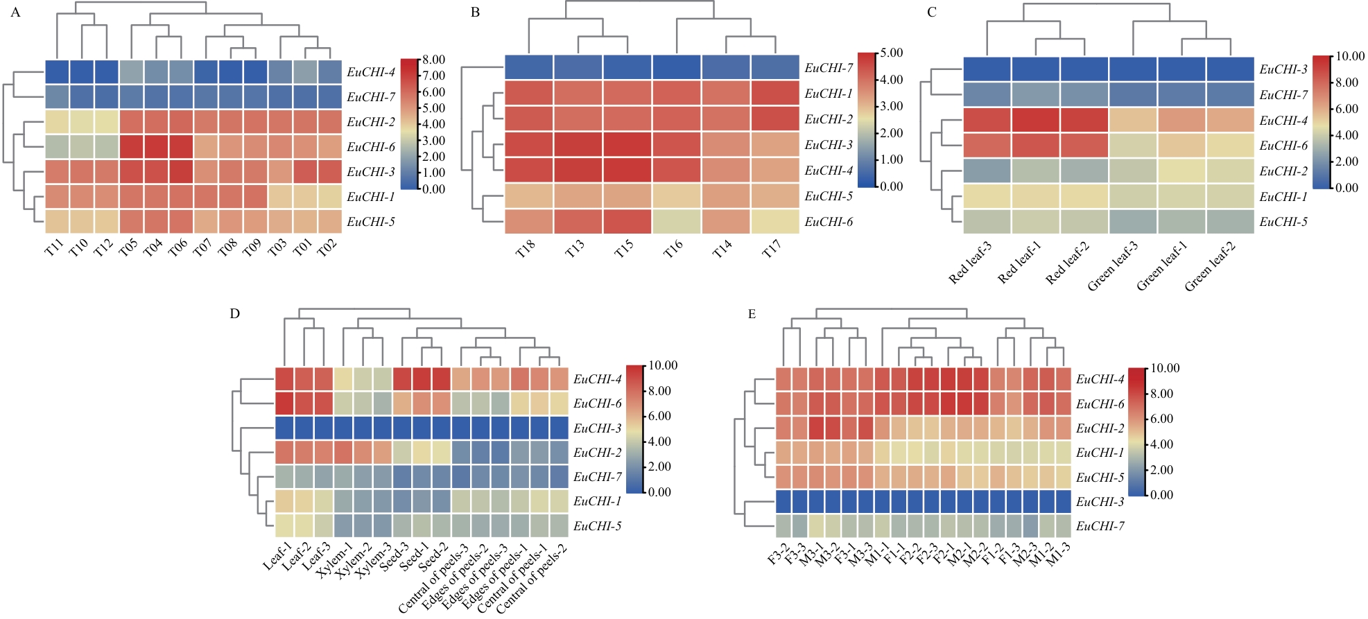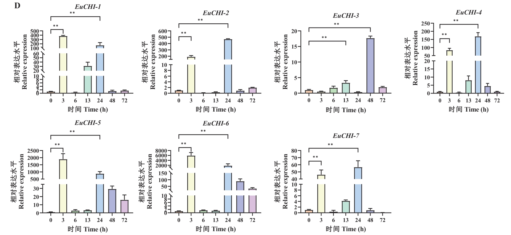 Key words: Eucommia ulmoides, CHI gene family, genome-wide identification, bioinformatics analysis, quantitative real-time PCR (RT-qPCR), hormone treatment, abiotic stress, expression characteristics