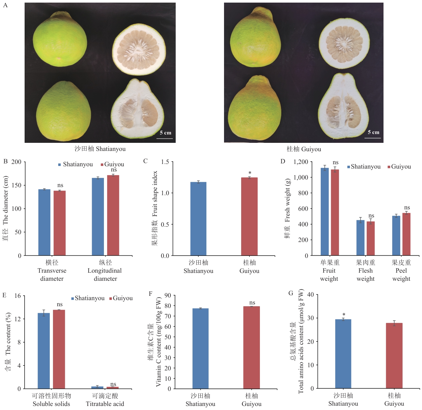Objective This study aims to elucidate the differences of fruit qualities and metabolic regulation between the self-pollinated cultivar pomelo ‘Guiyou No. 1’ and its female parent ‘Shatianyou’, it will provide a theoretical basis for future comprehensive research on the mechanisms of fruit quality formation and the metabolic regulation in pomelo. Method Based on physicochemical parameter measurements, transcriptomics, and widely targeted metabolomics, the fruit qualities, gene expression levels, and metabolite profiles were systematically analyzed in mature fruits of ‘Guiyou No.1’ and ‘Shatianyou’ pomelo. Result There were no significant differences in fruit weight, soluble solids content, titratable acidity, and vitamin C content between pomelo ‘Guiyou No.1’ and ‘Shatianyou’. Fruit shape index in ‘Guiyou No.1’ was significantly greater than that in ‘Shatianyou’, while the total amino acid content was significantly less than that in ‘Shatianyou’. Compared to ‘Shatianyou’, the 285 differentially expressed genes (DEGs) were screened, including 190 up-regulated genes and 95 down-regulated genes, respectively. These DEGs were primarily enriched in metabolic pathways, such as arginine and proline metabolism, fatty acid metabolism, and phenylpropanoid biosynthesis. Metabolome profiling suggested that a total of 90 differential metabolites were detected in ‘Guiyou No.1’, with 17 up-regulated and 30 down-regulated ones, compared with pomelo ‘Shatianyou’. Upregulated metabolites were mainly alkaloids and coumarins, while downregulated ones included amino acids, flavonoids, and phenolic acids. The differences of fruit quality between ‘Guiyou No.1’ and ‘Shatianyou’ were primarily influenced by the pathways of amino acids, alkaloids, and phenylpropanoids. Key genes such as GOT2, COMT, UGT73C, CYP71A and PAIC were identified as potentially playing crucial roles in the quality formation of pomelo fruits. Conclusion No significant differences in general qualities, are detected between mature fruits of ‘Guiyou No.1’ and ‘Shatianyou’ pomelo; however, there are obvious differences in terms of amino acids, flavonoids, phenolic acids, and alkaloids. The differential genes and metabolites between the two cultivars are mainly enriched in the metabolic pathways of amino acid and phenylpropanoid.