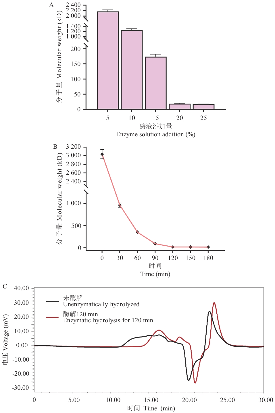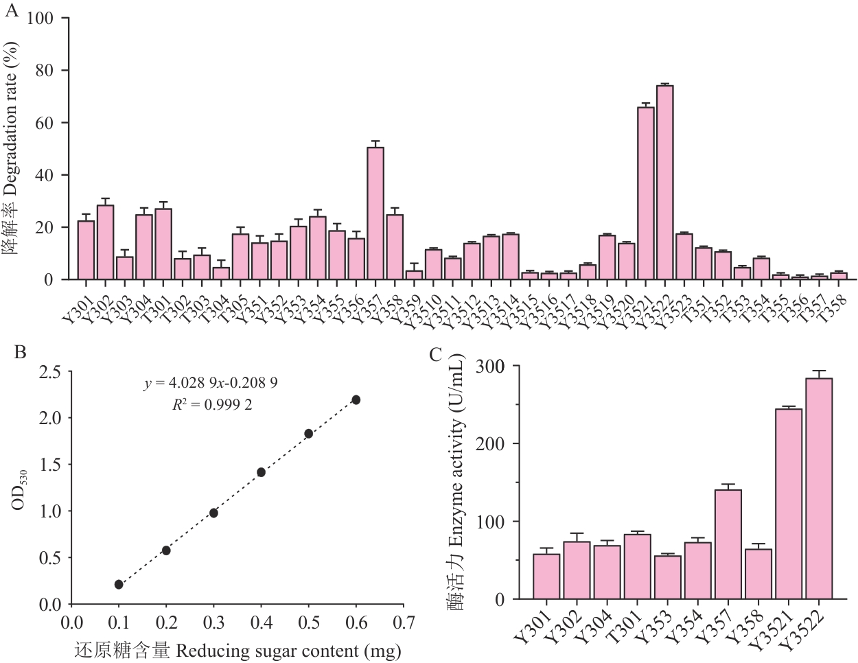 Objective Tremella fuciformis polysaccharides’ (TFPs) high molecular weight, high viscosity and other characteristics limit its biological activity and application. The purpose of this study is to screen strains with high yield of TFPs enzyme and optimize its fermentation conditions, so as to achieve the mass production of enzyme, thus effectively reduce the molecular weights of TFPs by enzymatic degradation method, and expand its application potential. Method Based on the characteristics of microbial enzymatic decomposition of TFPs, strains with TFPs as the sole carbon source were isolated from decomposed Tremella fuciformis samples. Combined the determination of TFPs degradation rate with 3,5-dinitrosalicylic acid (DNS) enzyme activity, strains with high yield of TFPs enzyme were screened. Single factor experiments and response surface methodology were used to optimize the fermentation medium (carbon source, nitrogen source, inorganic salts, etc.) and fermentation conditions (temperature, pH, rotation speed, etc.) of high-yield TFPs enzyme strains, and the catalytic characteristics (optimal pH, temperature, and degradation efficiency) of the TFPs enzyme were analyzed. Result The 40 strains isolated from the rotten T. fuciformis samples could use TFPs as sole carbon source, and 10 strains of them had high ability to degrade TFPs. The strain Y3522 with the highest enzyme activity was identified as Mesobacillus by 16S rRNA gene sequencing. The optimized medium components of Mesobacillus sp. Y3522 were as follows: TFPs (molecular weight of 1 250 kD) 8.07 g/L, casein peptone 25.47 g/L, K2HPO4 7.11 g/LNaCl 2.0 g/L,MgSO4·7H2O 1.0 g/L. The optimal fermentation conditions were a temperature of 35 ℃, pH of 7.5, inoculation volume of 3%, rotation speed of 250 r/min, and fermentation time of 18-24 h. After optimization, the enzyme activity increased by 60.1%. The optimal catalytic conditions for TFPs enzyme derived from Mesobacillus sp. Y3522 were pH 7.5 and temperature 35 ℃. In addition, 20% (V/V) crude enzyme solution degraded TFPs with a molecular weight of 3 000 kD (0.5%, m/V) to 922, 308, 85, and 18 kD at 30, 60, 90, and 120 min, respectively, demonstrating efficient molecular weight regulation ability. Conclusion The strain Mesobacillus sp. Y3522 producing high yield of TFPS are isolated and identified, its enzyme production fermentation system is optimized. The produced enzyme demonstrates efficient degradation ability on the molecular weights of TFPs.
