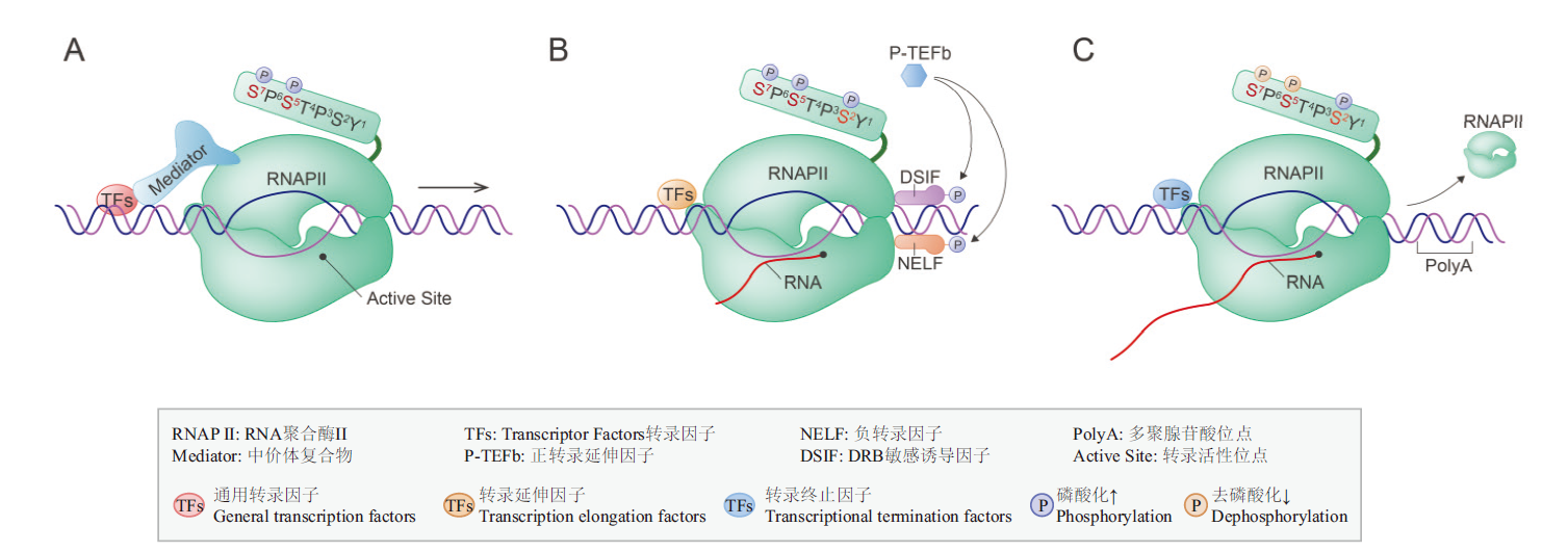 | 图1 RNAP II介导的转录过程 A:转录起始;B:转录延伸;C:转录终止 |