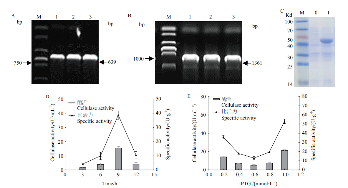 | Fig. 3 Heterologous expression of StGH61-11 recombinant protein and optimized induction conditions A: Agarose gel electrophoresis results of the target gene StGH61-11 PCR products, 1-3: GH61-11 cDNA fragment. M:DNA marker. B: Agarose gel electrophoresis results of PCR for recombinant transformants, 1-3: Pet32a-StGH61-11 recombinant plasmid, M:DNA marker. C: SDS-PAGE detection of whole bacterial lysate expressed by recombinant pET32a-StGH61-11(BL21), 0 : Pet32a-StGH61-11-BL21(DE3)not induce control, 1 : Pet32a-StGH61-11-BL21(DE3)the recombinant bacteria were induced by IPTG, M : Standard for molecular weight of pre-dyed protein. D: Effect of induction time on the enzymatic activity of recombinant protein StGH61-11. E: Effect of IPTG concentration on the enzymatic activity of recombinant protein StGH61-11 |