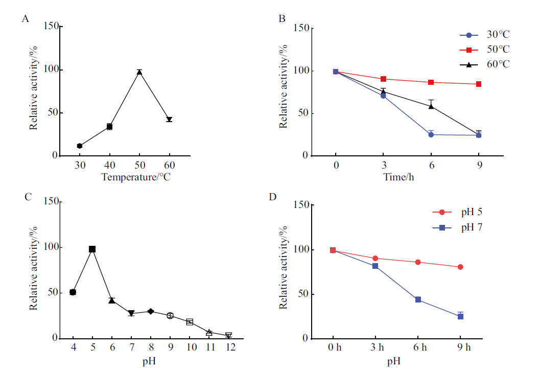 | Fig. 4 Optimal reaction temperature and stability and pH and stability of StGH61-11 recombinant protein A: Effects of temperature on the cellulase activity of StGH61-11. B: Effect of temperature on the stability of StGH61-11 cellulase activity. C: Effects of pH on StGH61-11 cellulase activity. D: Effect of pH on the viability stability of StGH61-11 cellulase |