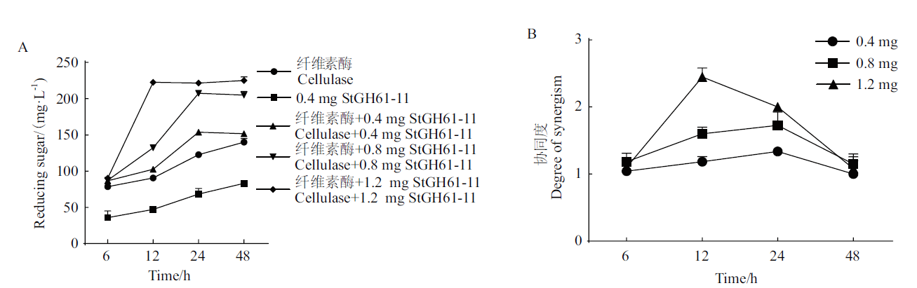 | Fig. 5 Synergistic reaction of StGH61-11 with cellulase hydrolysis of corn stover A: Promoting effect of StGH61-11 on cellulase activity. B: Synergism degree of StGH61-11 and cellulase |
