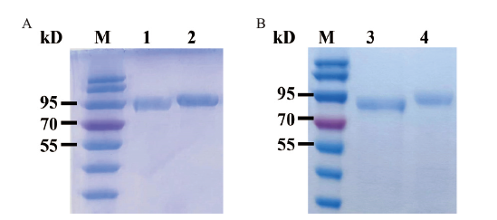 | 图3 野生型TlCel5、ReCel5和突变体TM1、TM2的SDS-PAGE分析 M:蛋白分子质量标准; A:野生型TlCel5、ReCel5的表达(1:ReCel5纯化蛋白;2:TlCel5纯化蛋白); B:突变体TM1、TM2的表达(3:突变体TM1纯化蛋白;4:突变体TM2纯化蛋白) |
