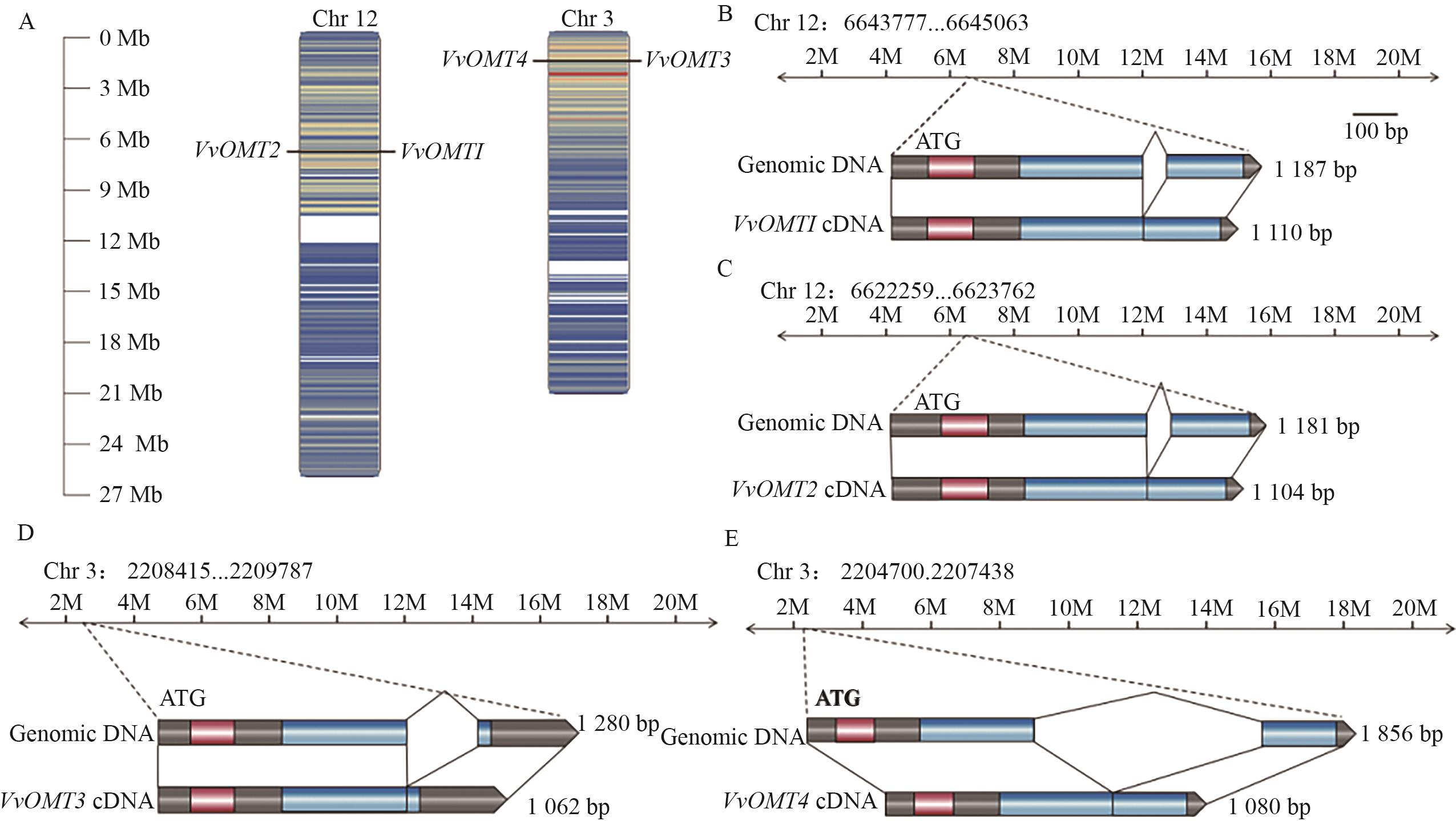 | 图1 VvOMTs家族成员染色体定位(A)和基因结构分析(B-E) |