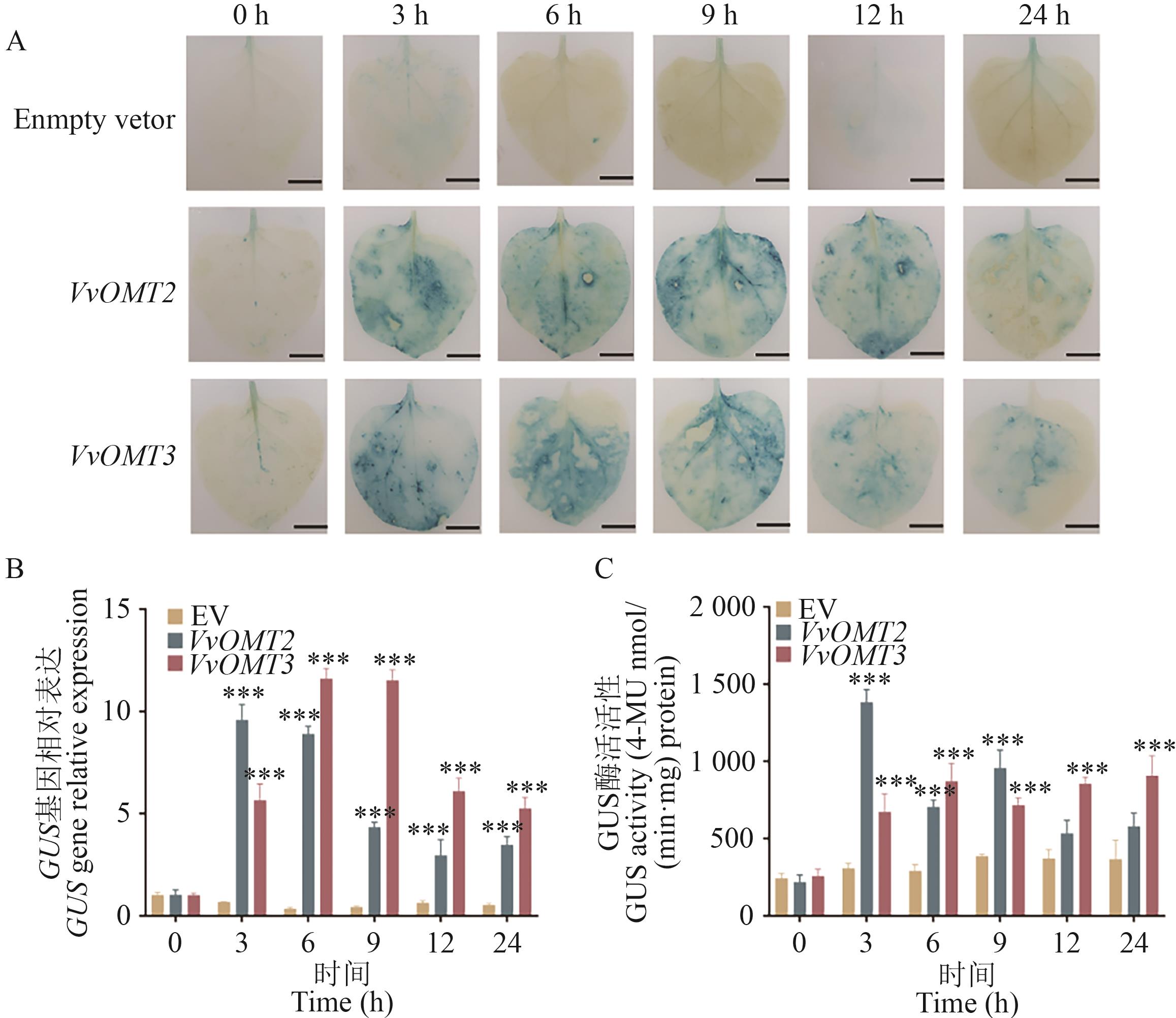 | Fig. 5 ‘Marselan’ grape VvOMTs gene promoters' responses to MeJA A: GUS staining of tobacco leaves after MeJA treatment with empty vector, VvOMT2/3 gene promoters, bar=1 cm. B: Relative expression level of GUS gene. C: GUS protease activity |